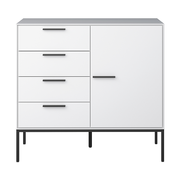 Komoda jest pojemna i praktyczna, wyposażona w cztery wygodne szuflady i szafkę, które pomieszczą wiele potrzebnych w domu rzeczy. Komoda SLIMLINE jest wykonana z wytrzymałej płyty meblowej, wykończenia z kolei wyprodukowano z twardej i eleganckiej stali. Dzięki dobrym zawiasom i prowadnicom ta komoda z szufladami będzie dobrze służyć w twoim domu przez długi czas.