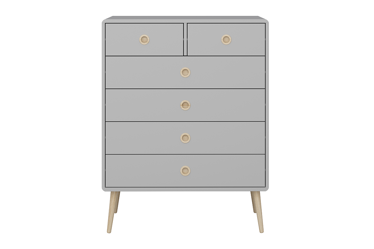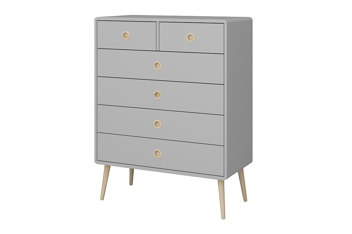 Piękna komoda wyposażona w 6 szuflad różnej wielkości na szpargały małe i duże. 4 dolne szuflady dedykowane są do przechowywania ubrań lub tekstyliów domowych, a 2 mniejsze posłużą na idealny schowek mniejszych przedmiotów. Komoda dzięki dobrej jakości prowadnicom, będzie z łatwością się otwierać. Ta duża komoda zrobiona została z dobrej jakości płyty meblowej, która również dobrze się prezentuje.