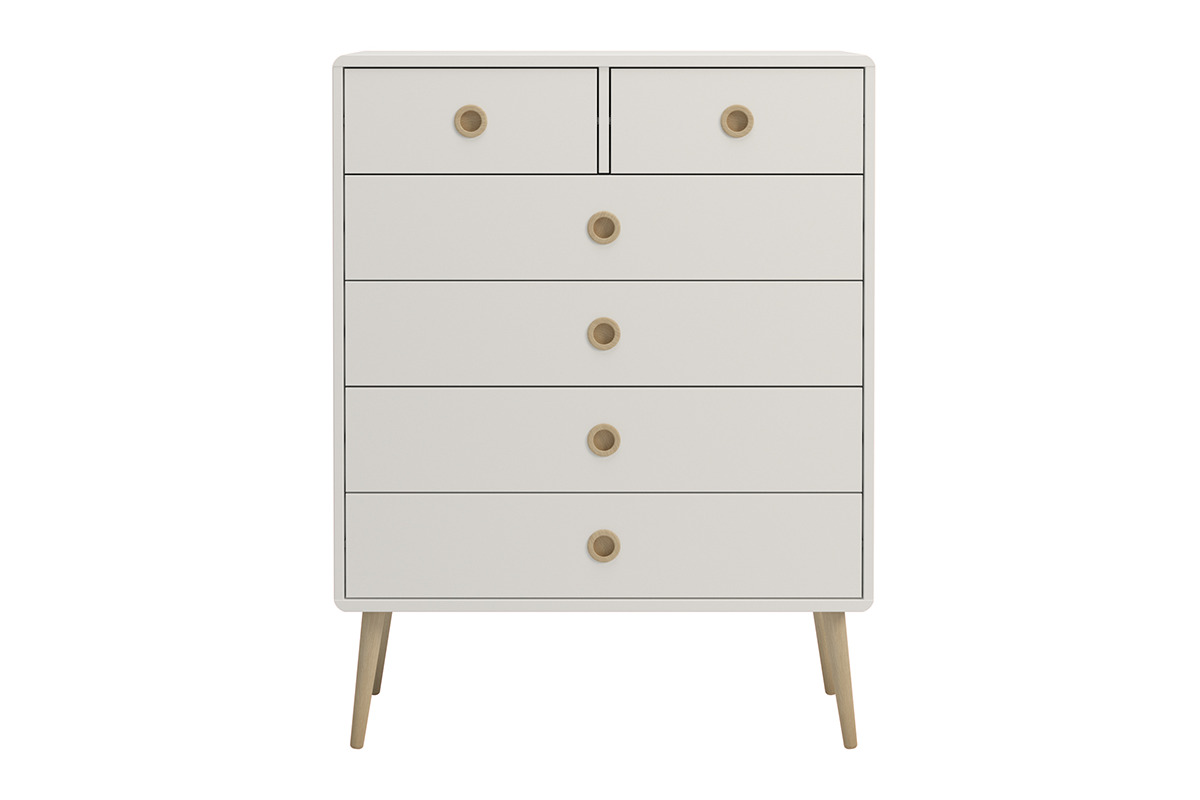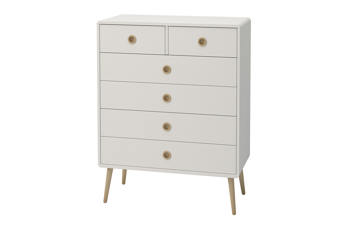 Piękna komoda wyposażona w 6 szuflad różnej wielkości na szpargały małe i duże. 4 dolne szuflady dedykowane są do przechowywania ubrań lub tekstyliów domowych, a 2 mniejsze posłużą na idealny schowek mniejszych przedmiotów. Komoda dzięki dobrej jakości prowadnicom, będzie z łatwością się otwierać. Ta duża komoda zrobiona została z dobrej jakości płyty meblowej, która również dobrze się prezentuje.
