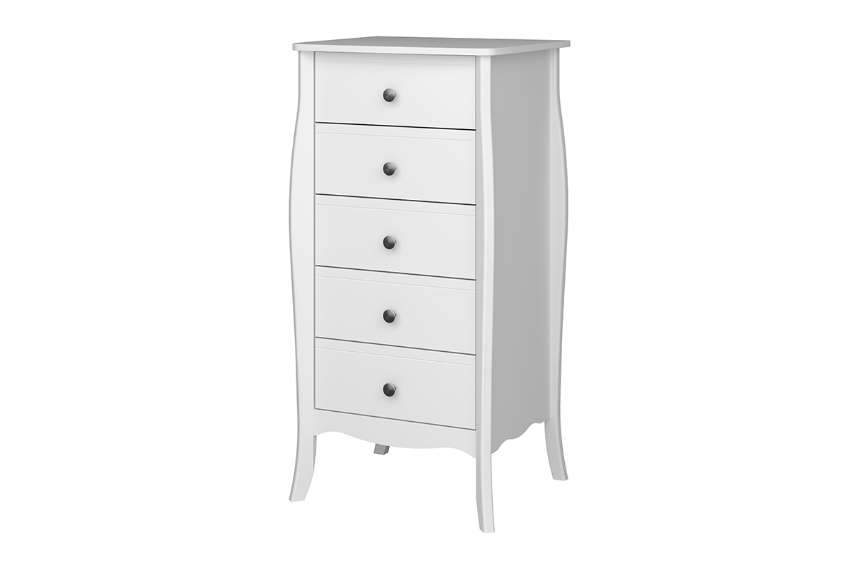 Wysoka, efektowna komoda w stylu barokowym, idealna do salonu, sypialni lub gabinetu. Komoda zajmuje niedużo miejsca, a może pomieścić wiele rzeczy, a to dzięki 5 pojemnym szufladom. Zamontowano w nich dobrej jakości prowadnice, dzięki którym odsuwanie i zasuwanie szuflad jest wygodne i łatwe.Barokowa komoda wykonana została z dobrych i trwałych materiałów, żebyś mógł z niej korzystać latami.