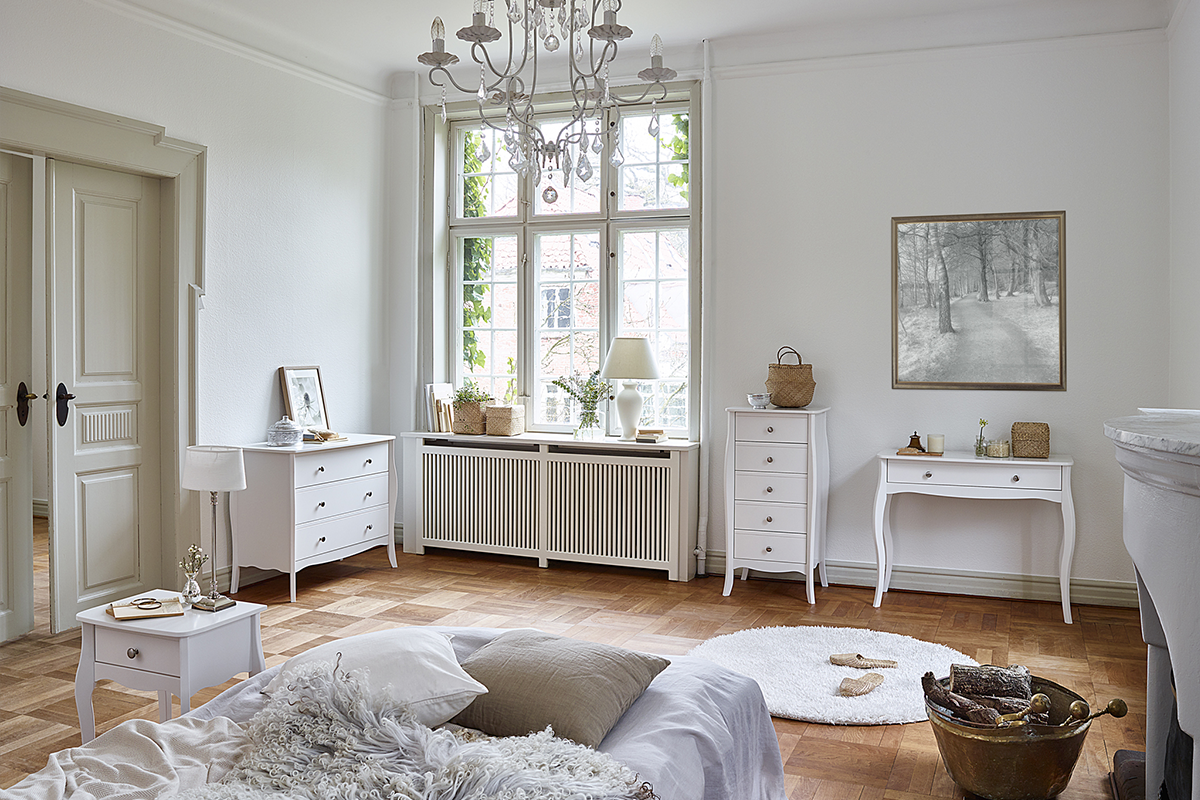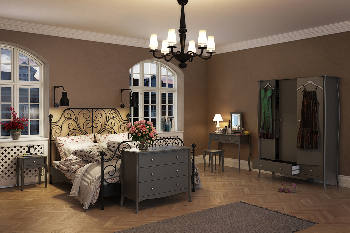 Jest dostępna w 3 pięknych kolorach bieli, czerni i szarości. Każda wersja kolorystyczna jest wykończona stalowanymi uchwytami stylizowanymi na stare, co nadaje komodzie dodatkowego uroku.