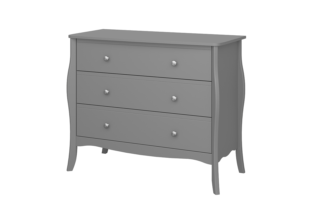Piękna i pojemna komoda w barokowym stylu w trzech wersjach kolorystycznych. Pięknej bieli, intensywnej szarości oraz ponadczasowej czerni. Idealna propozycja dla mieszkań urządzonych w stylu ludwikowskim lub klasycznym. Komoda wykończona postarzanymi uchwytami, dzięki którym łatwo będziesz mógł ją otworzyć. Zastosowanie dobrej jakości prowadnic gwarantuje długie i wygodne użytkowanie.Barokowa komoda ma 3 duże szuflady, w których schowasz wszystkie skarby, twojego małego domowego królestwa.