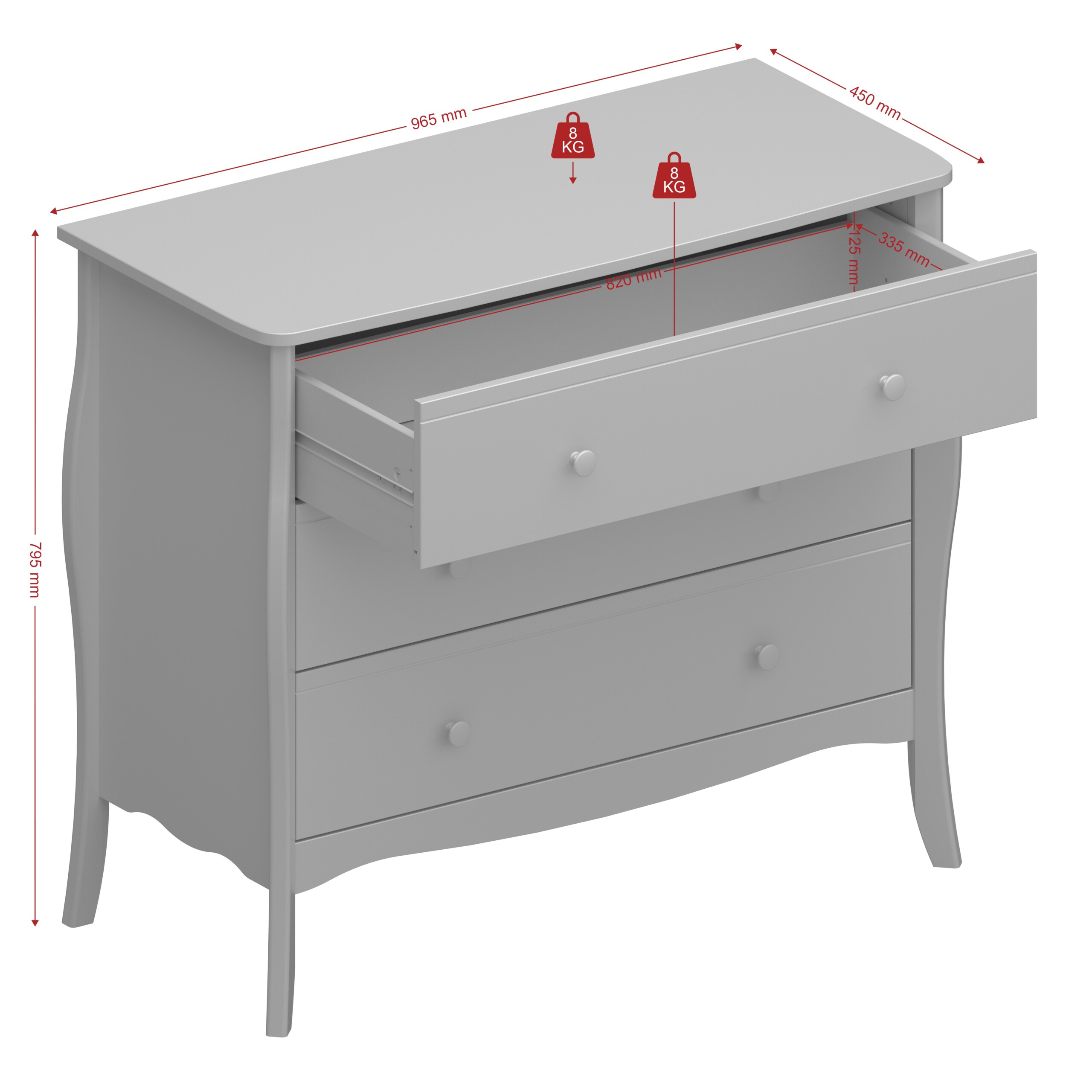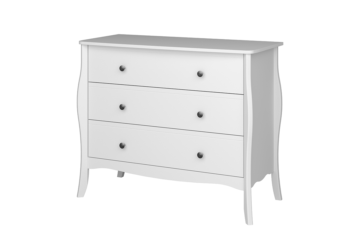 Piękna i pojemna komoda w barokowym stylu w trzech wersjach kolorystycznych. Pięknej bieli, intensywnej szarości oraz ponadczasowej czerni. Idealna propozycja dla mieszkań urządzonych w stylu ludwikowskim lub klasycznym. Komoda wykończona postarzanymi uchwytami, dzięki którym łatwo będziesz mógł ją otworzyć. Zastosowanie dobrej jakości prowadnic gwarantuje długie i wygodne użytkowanie.Barokowa komoda ma 3 duże szuflady, w których schowasz wszystkie skarby, twojego małego domowego królestwa.