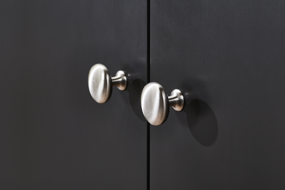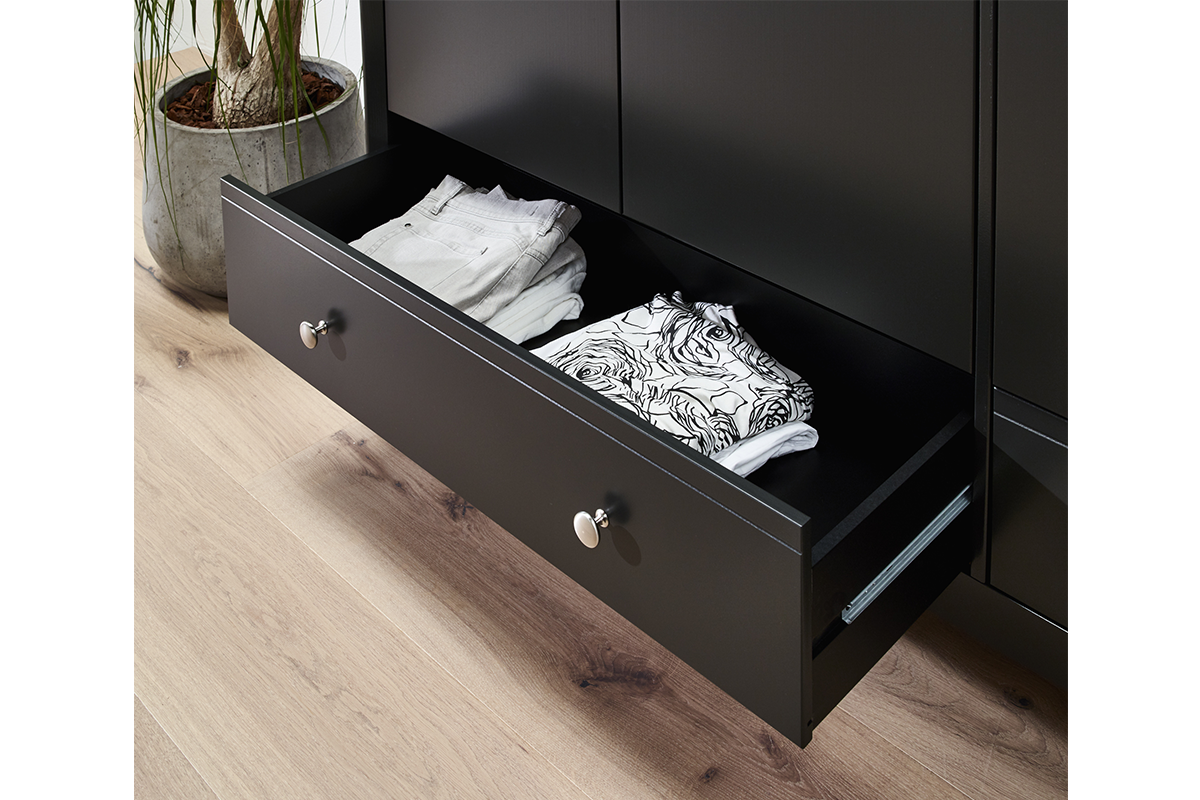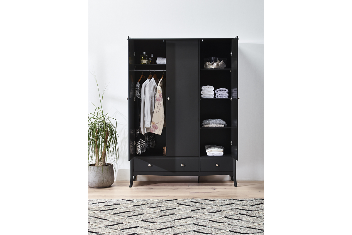 Duża i bardzo pojemna, elegancka szafa o monumentalnej bryle, idealna do garderoby lub dużej sypialni. Ta ogromna szafa pomieści z pewnością całą garderobę domowników oraz wszystkie tekstylia domowe. Trzydrzwiowa szafa w jednej części ma solidny drążek, w drugiej z kolei kilka pojemnych półek, na dole dodatkowo jest wyposażona w 3 szuflady, przeznaczone do przechowywania bielizny lub ubrań do spania. Duża ludwikowska szafa dostępna jest w kolorze czarnym, wykończona ergonomicznymi, stalowymi uchwytami, stylizowanymi na stare. Ten wysokogatunkowy mebel z pewnością będzie służył Tobie i Twojej rodzinie przez wiele lat.