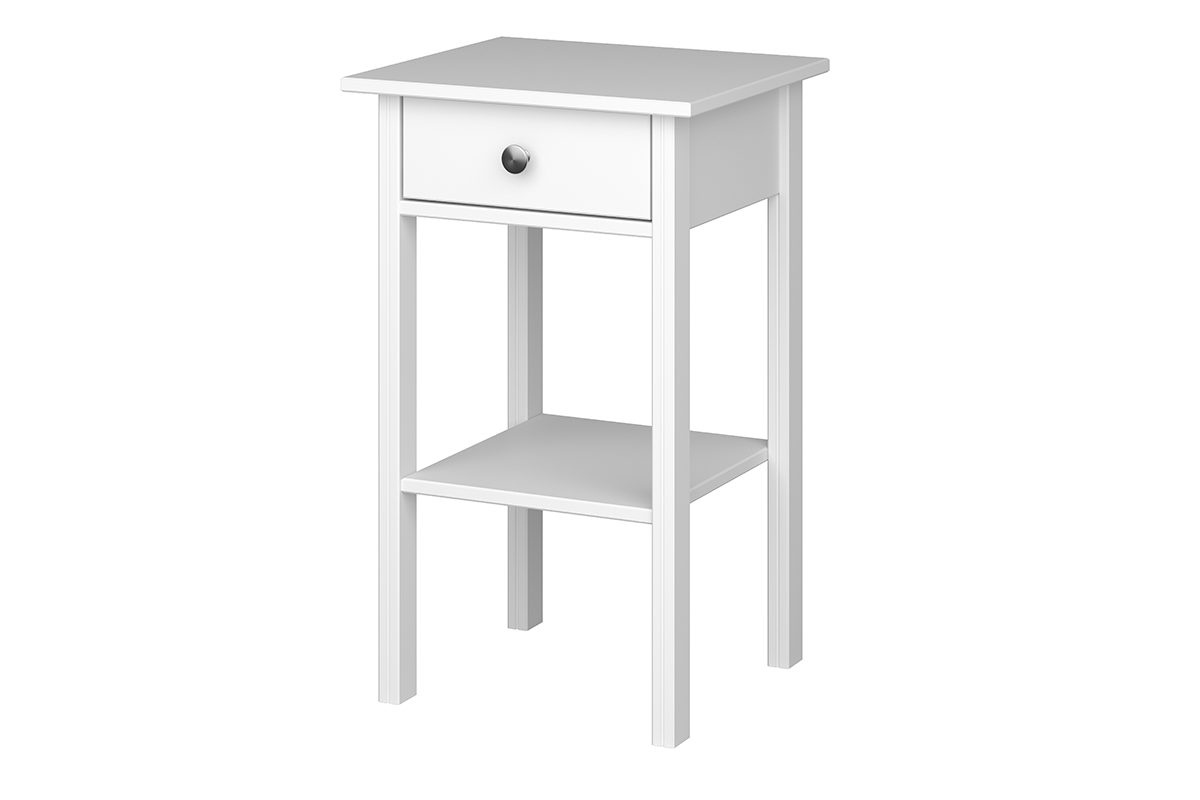 Kompaktowy stolik nocny w >tradycyjnym stylu. Ten piękny mebel zwraca uwagę niezwykłą prostotą formy oraz dbałością o detale. Stolik nocny jest wyposażony w półkę na dole i małą szufladę na różne osobiste rzeczy, ma proste, kwadratowe nogi. Wykonany jest z wysokiej jakości płyty meblowej, wykończony ładną okleiną, odporną na ścieranie. Mały stolik nocny z kolekcji TROMSÖ dostępny jest w trzech uniwersalnych kolorach, bieli, czerni i szarości, zatem niezależnie od tego, fanem, którego koloru jesteś, na pewno znajdziesz idealną wersją stolika do swojego domu. Mała szuflada ma metalowy, wygodny uchwyt do otwierania.