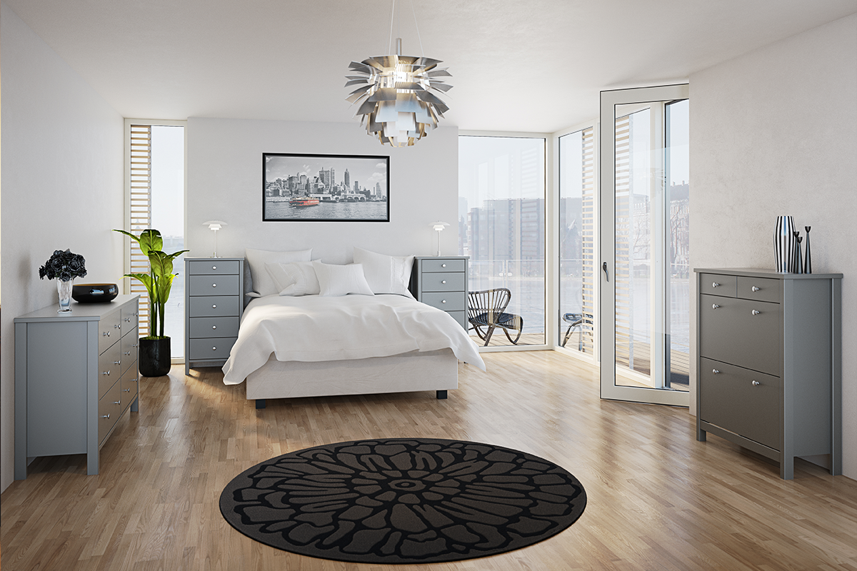 Meble dostępne są w trzech uniwersalnych kolorach, idealnych do minimalistycznych i klasycznych mieszkań. Możesz wybrać pomiędzy elegancką czernią, rozjaśniającą bielą i zdecydowaną, zimną szarością.Te proste meble wykonane są z solidnej płyty meblowej, pokrytej ładnie prezentującą się okleiną, która jest odporna na blaknięcie, a jednocześnie łatwo utrzymać ją w czystości. Producent zastosował wysokiej jakości mechanizmy, zawiasy i prowadnice, aby korzystanie z mebli było naprawdę wygodne i łatwe.
