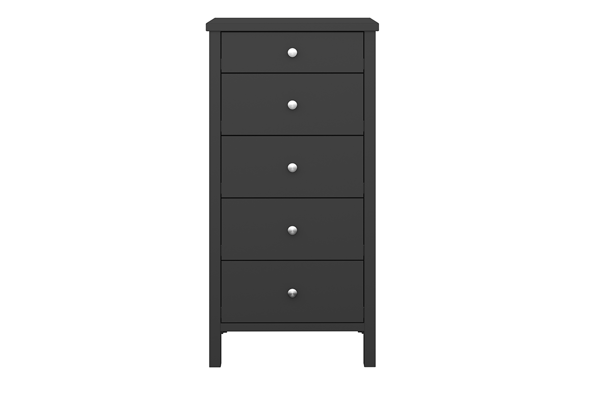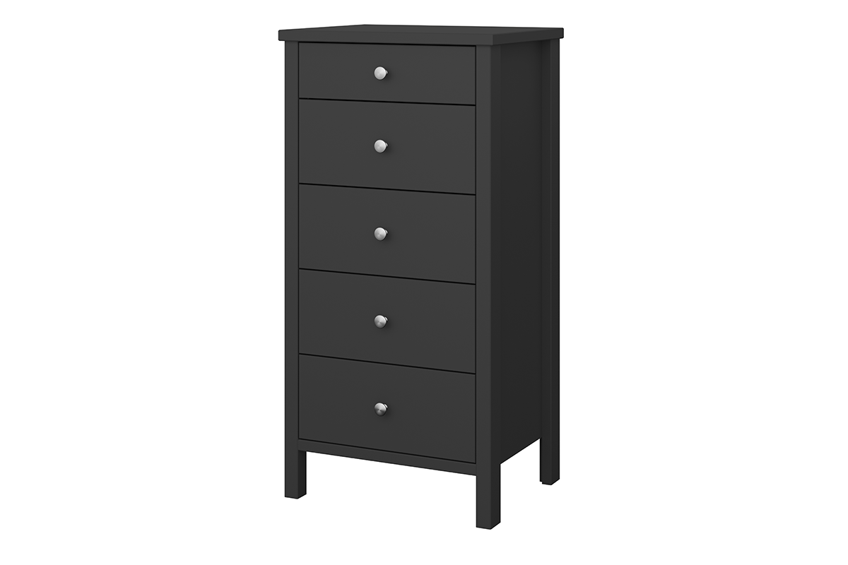 Mała komoda z kolekcji TROMSÖ to nasza dedykacja dla miłośników tradycyjnych, prostych form oraz nieszablonowych mebli. Ta minimalistyczna komoda skrywa w sobie wiele możliwości. Wyposażona jest w 5 pojemnych szuflad, w których zmieścisz ścinki dzieciństwa, teczki wspomnień i inne skarby.Wysoka, tradycyjna komoda dostępna jest w 3 kolorach, rozjaśniającej bieli, eleganckiej czerni i szykownej, intensywnej szarości.