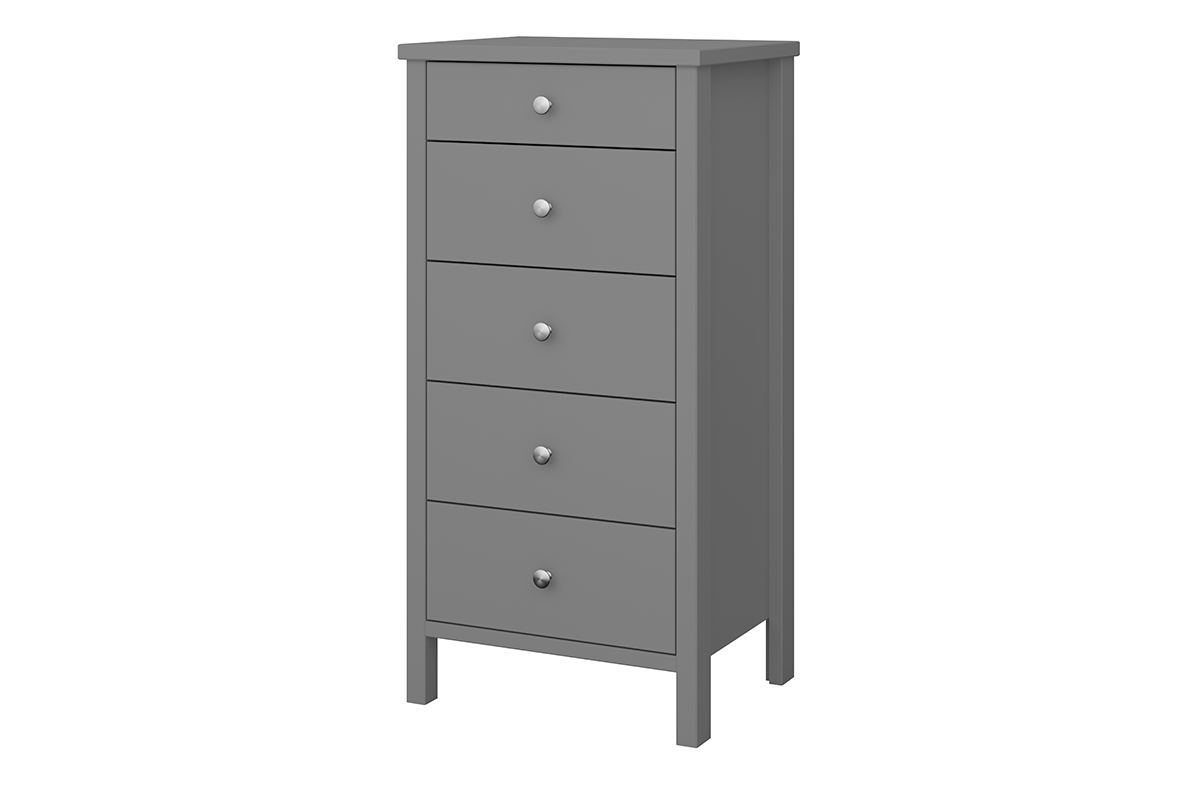 Mała komoda z kolekcji TROMSÖ to nasza dedykacja dla miłośników tradycyjnych, prostych form oraz nieszablonowych mebli. Ta minimalistyczna komoda skrywa w sobie wiele możliwości. Wyposażona jest w 5 pojemnych szuflad, w których zmieścisz ścinki dzieciństwa, teczki wspomnień i inne skarby.Wysoka, tradycyjna komoda dostępna jest w 3 kolorach, rozjaśniającej bieli, eleganckiej czerni i szykownej, intensywnej szarości.