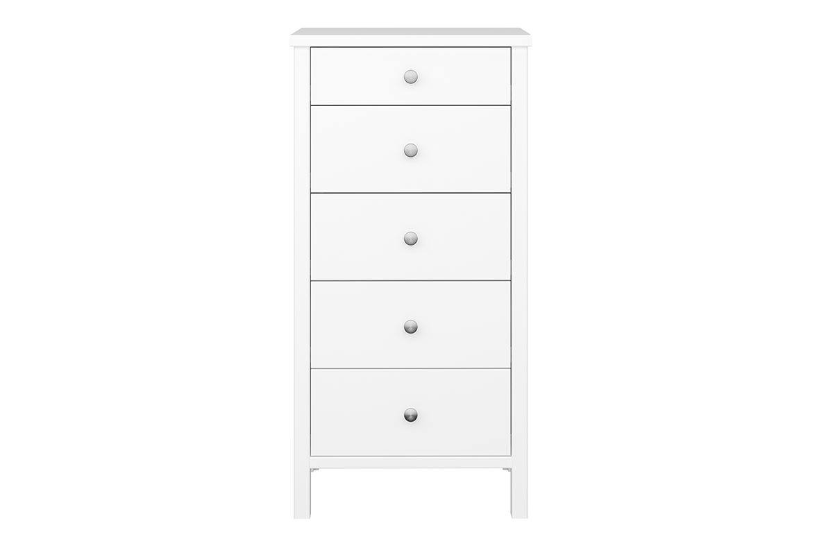 Mała komoda z kolekcji TROMSÖ to nasza dedykacja dla miłośników tradycyjnych, prostych form oraz nieszablonowych mebli. Ta minimalistyczna komoda skrywa w sobie wiele możliwości. Wyposażona jest w 5 pojemnych szuflad, w których zmieścisz ścinki dzieciństwa, teczki wspomnień i inne skarby.Wysoka, tradycyjna komoda dostępna jest w 3 kolorach, rozjaśniającej bieli, eleganckiej czerni i szykownej, intensywnej szarości.