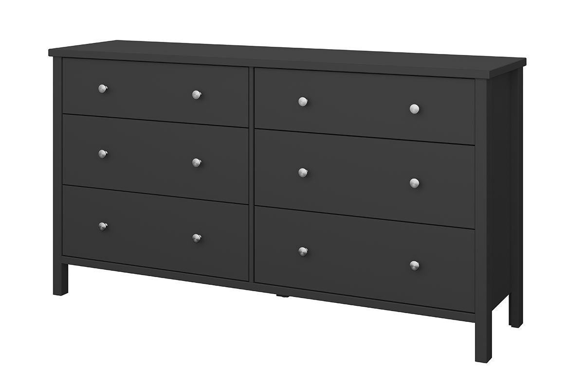 Piękna, klasyczna i do tego duża, bardzo pojemna komoda w trzech klasycznych, uniwersalnych kolorach, eleganckiej czerni, chłodnej szarości i rozjaśniającej pomieszczenia bieli. Zatem niezależnie od tego, czy jesteście miłośnikami białych mebli, czy też przeciwnie czarnobrązowych, znajdziesz model idealny do swojego domu.Komoda ma 6 dużych szuflad, umieszczonych w dwóch kolumnach po 3 z każdej strony.