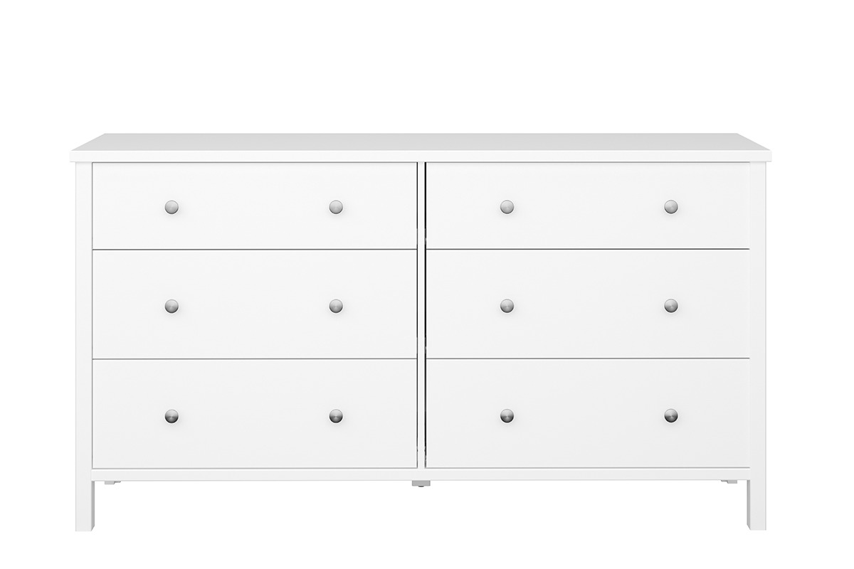 Piękna, klasyczna i do tego duża, bardzo pojemna komoda w trzech klasycznych, uniwersalnych kolorach, eleganckiej czerni, chłodnej szarości i rozjaśniającej pomieszczenia bieli. Zatem niezależnie od tego, czy jesteście miłośnikami białych mebli, czy też przeciwnie czarnobrązowych, znajdziesz model idealny do swojego domu.Komoda ma 6 dużych szuflad, umieszczonych w dwóch kolumnach po 3 z każdej strony.