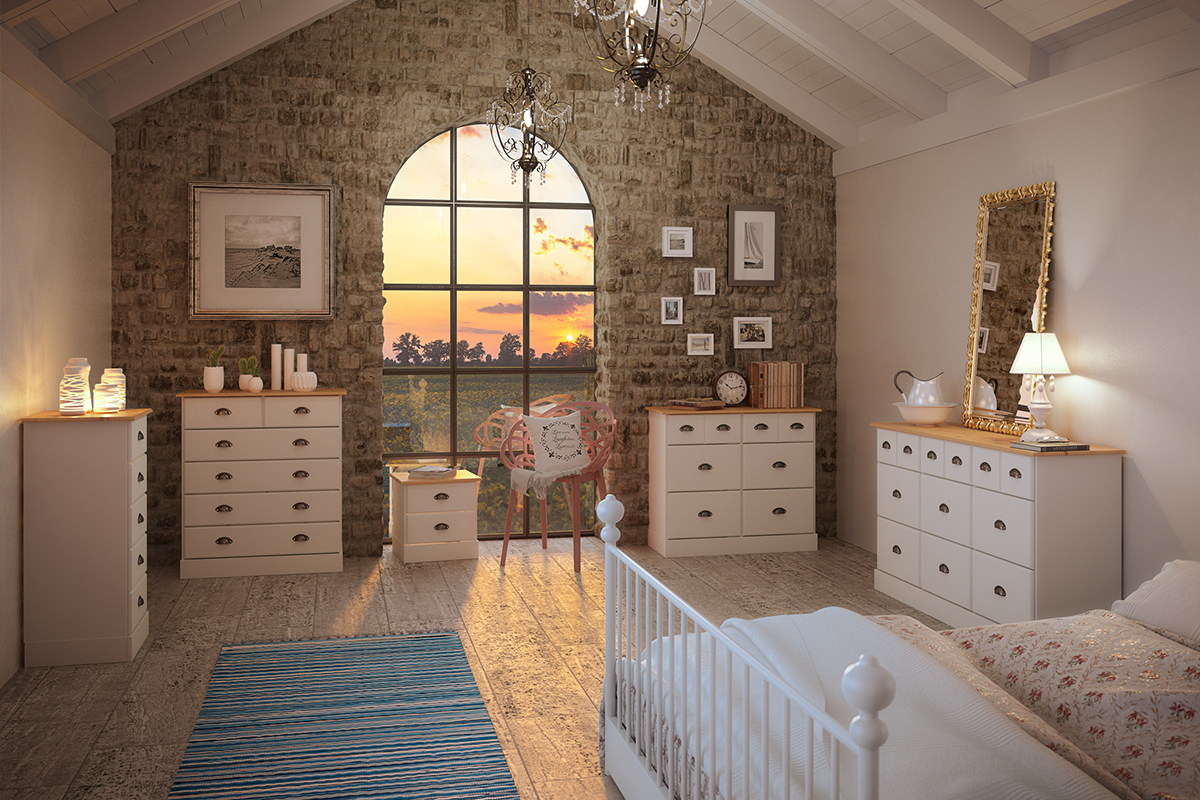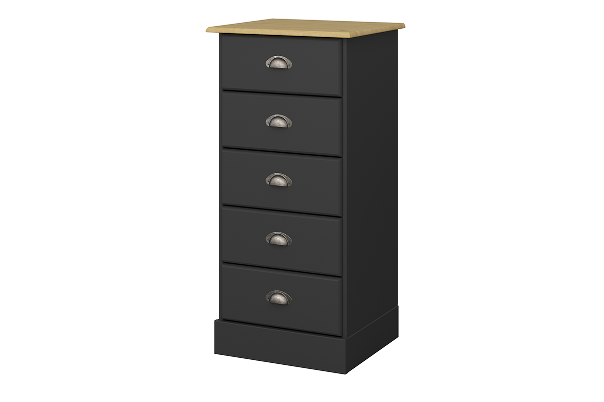 Wąska komoda z 5 pojemnymi szufladami z blatem w kontrastowym kolorze. Ten piękny mebel łączy w sobie prostą formę, ciekawe , wyrafinowane zdobienia z metalu oraz odważną kolorystykę, będąc dzięki nim meblem klasycznym, ale z charakterem. Ta wąska komoda dostępna jest w kolorze białym i czarnym, a w każdej wersji blat jest w kolorze naturalnej sosny.