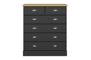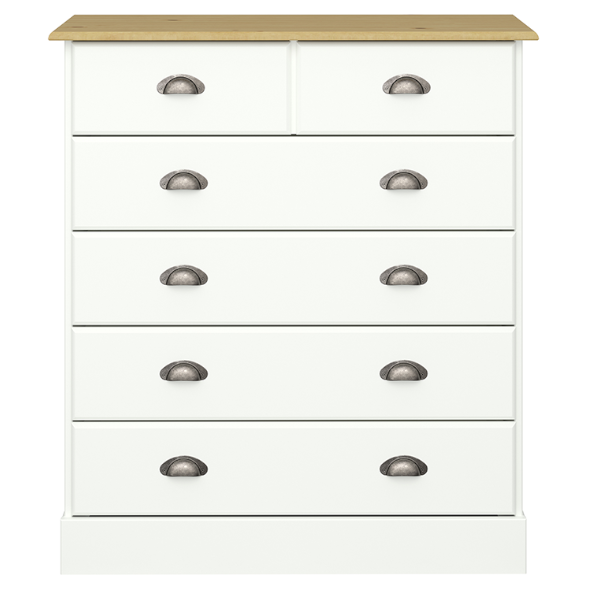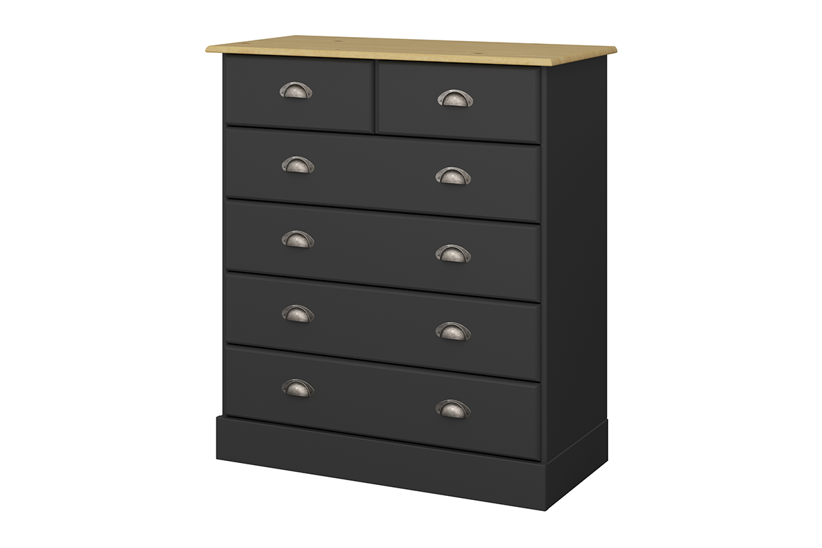 Komoda dostępna jest w dwóch kolorach, czarnym i białym, i dla oby dwóch jednakowym blatem w kontrastowym, jasnym odcieniu naturalnej sosny. Wysoka komoda NOLA to solidny mebel, wykonany z dobrej jakości materiałów i solidnych mechanizmów, które zapewniają jego niezawodne funkcjonowanie przez długi czas.