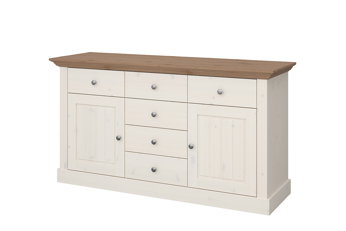 Piękna i pojemna komoda w stylu kolonialnym, w uniwersalnym białym kolorze z górnym blatem w odcieniu naturalnego drewna sosnowego, w zależności od wariantu w odcieniu od jasnego do ciemnego lub wenge. Komoda ma pięknie zdobione geometrycznymi żłobieniami fronty oraz zamontowane ładne, ergonomiczne uchwyty ze stali. Ta duża komoda z linii MONACO ma trzy pojemne szafki i dwie duże szuflady na mniejsze przedmioty.