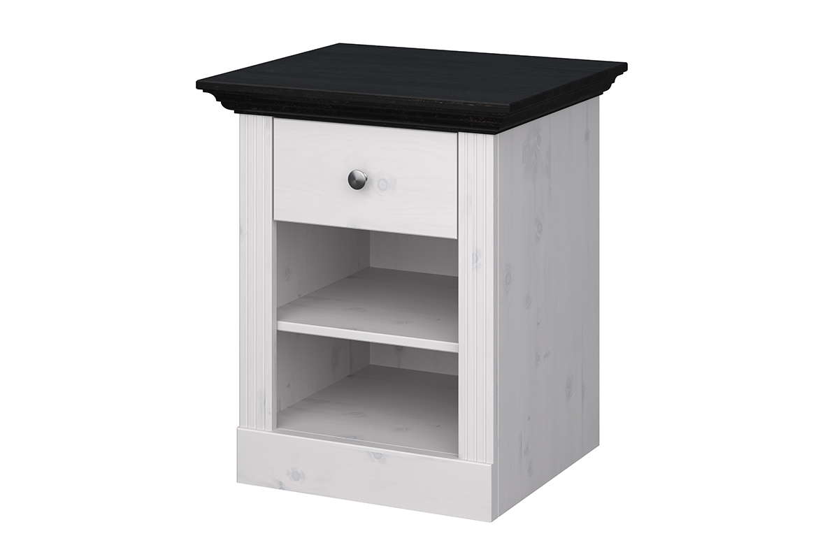 Śliczny, kompaktowy stolik do sypialni z szufladką i dwoma małymi półkami. Stolik nocny MONACO ma klasyczny biały kolor i świetnie pasuje do sypialni, zwłaszcza tych niewielkich, które nieco rozjaśnia. Stolik ma blat w kontrastowym kolorze wenge lub ciemnej sosny, co dodaje mu animuszu i przyciąga uwagę. Ten mały stolik nocny w kolonialnym stylu wykonany jest z litego drewna sosnowego. Szuflada stolika ma mały, ergonomiczny uchwyt z metalu stylizowanego na postarzany. W kolekcji MONACO znajdziecie inne meble do sypialni, m.in. komody i szafy.