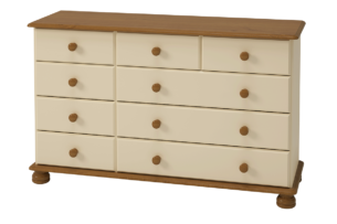 Szeroka komoda z kolekcji RICHMOND z pewnością sprosta wszelkim oczekiwaniom. Jeśli marzysz o meblu, dzięki któremu w Twoim domu zapanuje ład i porządek – aż dziewięć przestronnych szuflad opartych na niezawodnych i cichych prowadnicach kulkowych z łatwością pomieści wszelkie przedmioty użytku codziennego. Komoda wyposażona jest w 6 mniejszych i trzy większe szuflady, co dodatkowo ułatwi rozmieszczenie przedmiotów w sposób w pełni zorganizowany.