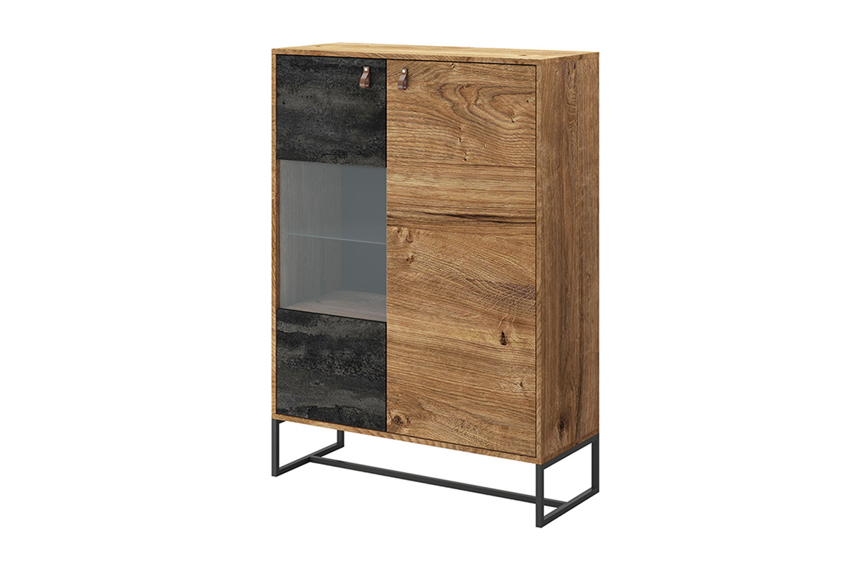 Dębowa komoda z kolekcji RUGO łączy w sobie balans drewna i czerni, przełamane frontem ze szkła hartowanego. Transparentny element wprowadza nową jakość i charakter, czyniąc mebel bardziej atrakcyjnym oraz nietuzinkowym. Zastosowanie gabloty idealnie sprawdzi się przy ekspozycji szkła bądź rodzinnych pamiątek. Całość można dodatkowo wzmocnić poprzez oświetlenie LED, które rozjaśni wnętrze, będąc przyjemną ozdobą pomieszczenia.
