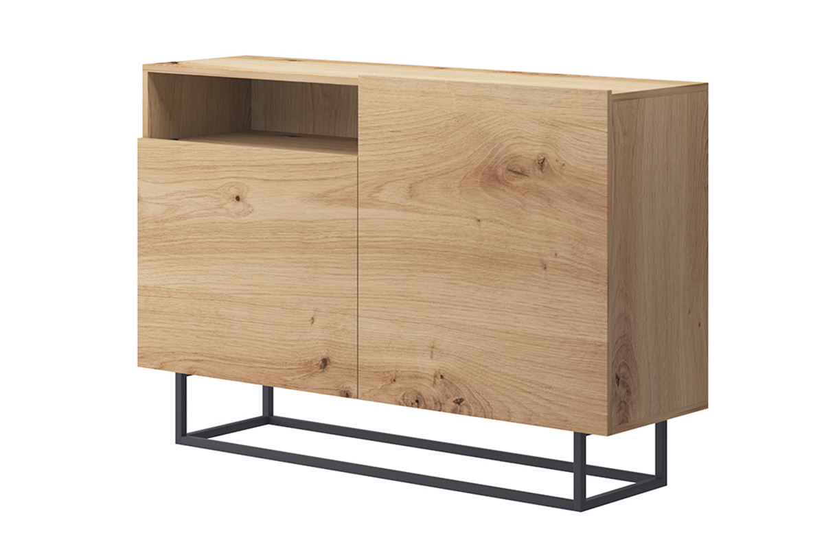 Dwudrzwiowa komoda z kolekcji MORIO świetnie pasuje do wnętrz w stylu nowoczesnym. Korpus z naturalnego drewna oparty jest na eleganckim, metalowym stelażu. Komoda posiada otwartą wnękę, co jest nie tylko praktyczne, ale również sprawia, że bryła wygląda ciekawiej.