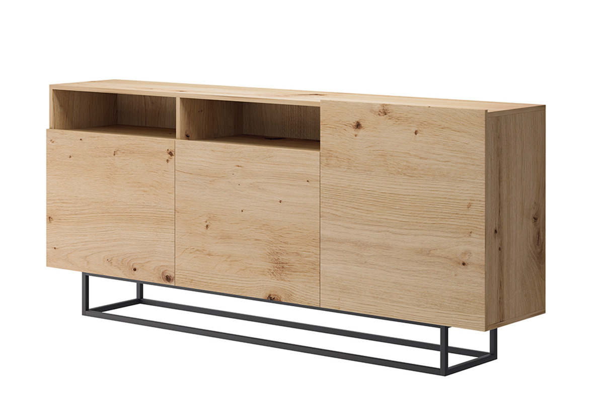 Trzydrzwiowa komoda z kolekcji MORIO świetnie pasuje do wnętrz w stylu nowoczesnym. Korpus z naturalnego drewna oparty jest na eleganckim, metalowym stelażu. Komoda posiada dwie otwarte wnęki, co jest nie tylko praktyczne, ale również sprawia, że bryła wygląda ciekawiej.