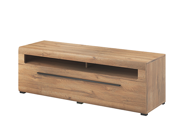 Mała szafka RTV z kolekcji Tulsa idealnie sprawdzi się w salonie jako podstawka pod wszelkiego rodzaju sprzęt elektroniczny. Ten kompaktowy mebel może mieć zastosowanie praktycznie w każdym domowym pomieszczeniu. W szafce znajduje się podwójna szuflada oraz szeroka wnęka, w której można swobodnie umieścić m.in. sprzęt RTV, a także ukryć nieestetyczne okablowanie.