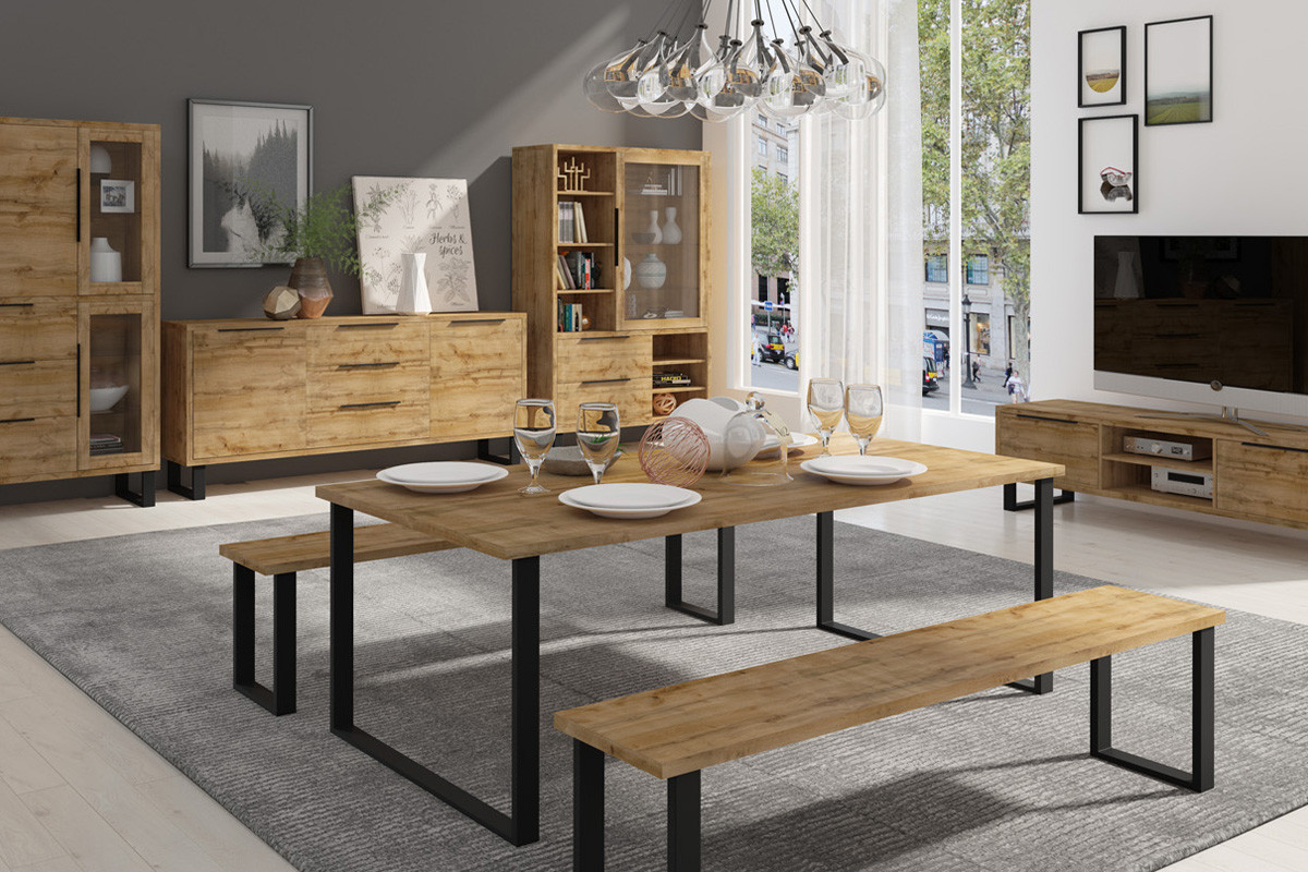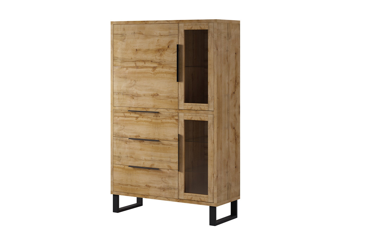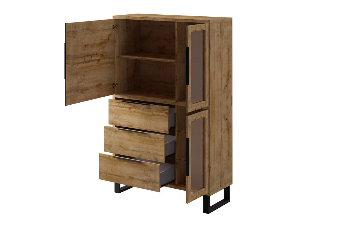 Trzydrzwiowa witryna z kolekcji HALLE to mebel, który idealnie wpisze się w nowoczesne i ponadczasowe wnętrza. Naturalne, piękne wybarwienie dębowego drewna doskonale współgra z czarnymi metalowymi nóżkami i uchwytami.Wykonana z najwyższej jakości płyty MDF, niezwykle trwałej i łatwej do utrzymania w czystości. Całość została zaprojektowana tak, aby tworzyła piękną solową ozdobę domu, a dla posiadających większe przestrzenie- połączenie jej z innymi meblami z kolekcji HALLE gwarantuje efekt harmonii i ładu.