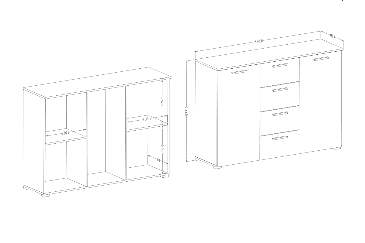 Komoda z kolekcji Galaxy posiada cztery szuflady ulokowane w centralnej części mebla. Po bokach do dyspozycji są cztery duże, zamykane półki. Komoda została wykonana z trwałej i odpornej na zarysowania płyty MDF. Puszkowe zawiasy zapewniają cichą i sprawną pracę drzwiczek a elementy ruchome szuflad oparto na sprawdzonych prowadnicach kulkowych.