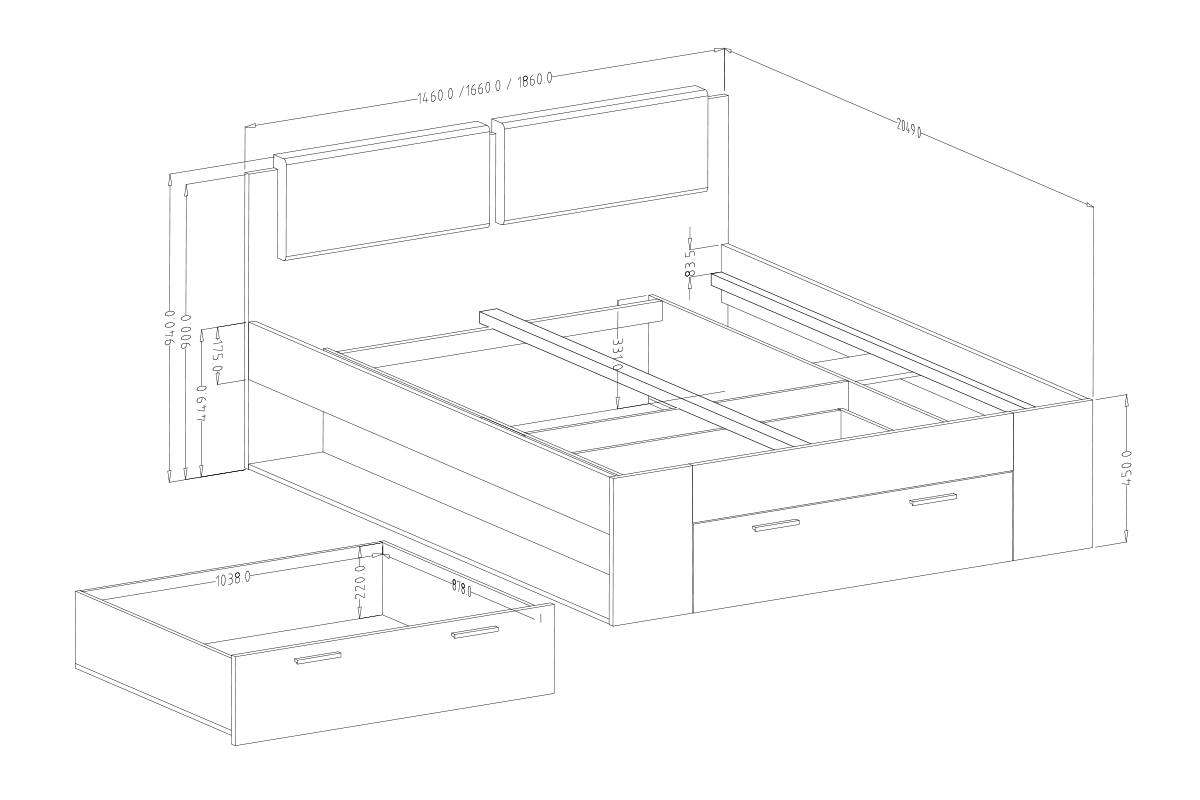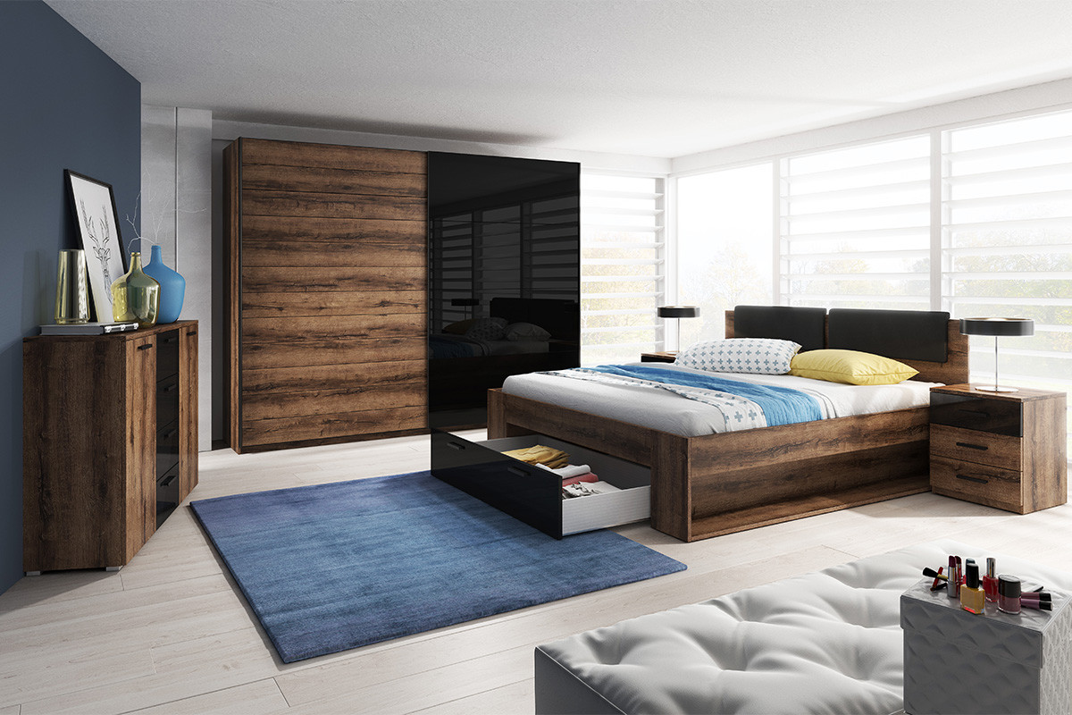 Łóżko zostało pokryte kolorem ciemnego dębu. Zagłowie łóżka jest tapicerowane w kolorze czarnym. Również w czerni wykonano front szuflady. Łóżko nawiązuje do stylistyki skandynawskiej, jest proste, klasyczne i doskonale sprawdzi się w stylowej sypialni. Będzie też świetnie współgrało z eleganckimi szafkami nocnymi, oferowanymi przez producenta.