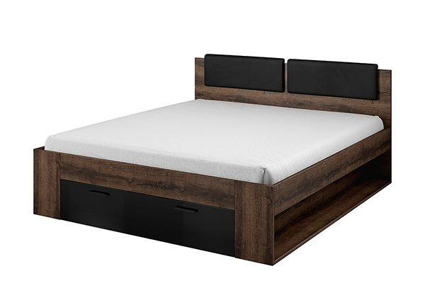 Dla łóżka wybrano kolor ciemnego dębu. Czarne zagłowie łóżka jest tapicerowane. Również w czerni wykonano front szuflady. Łóżko nawiązuje do stylu skandynawskiego, jest proste, klasyczne i doskonale sprawdzi się w stylowej sypialni. Będzie też świetnie współgrało z eleganckimi szafkami nocnymi, oferowanymi przez producenta.