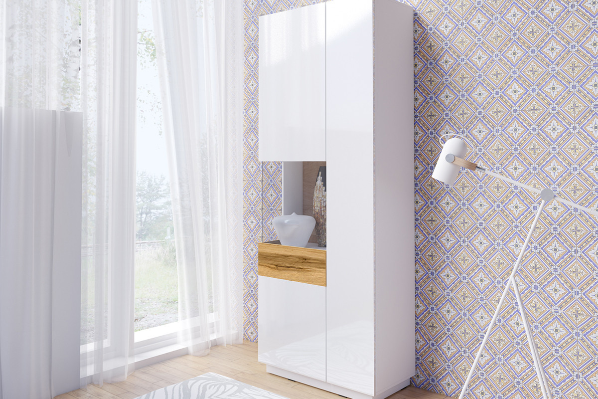 SILKE zobacz całą kolekcję Witryna Lewa - kolor biały połysk/dąb