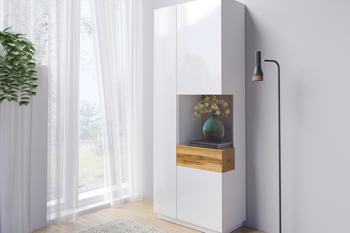 SILKE zobacz całą kolekcję Witryna Prawa - kolor biały połysk/dąb