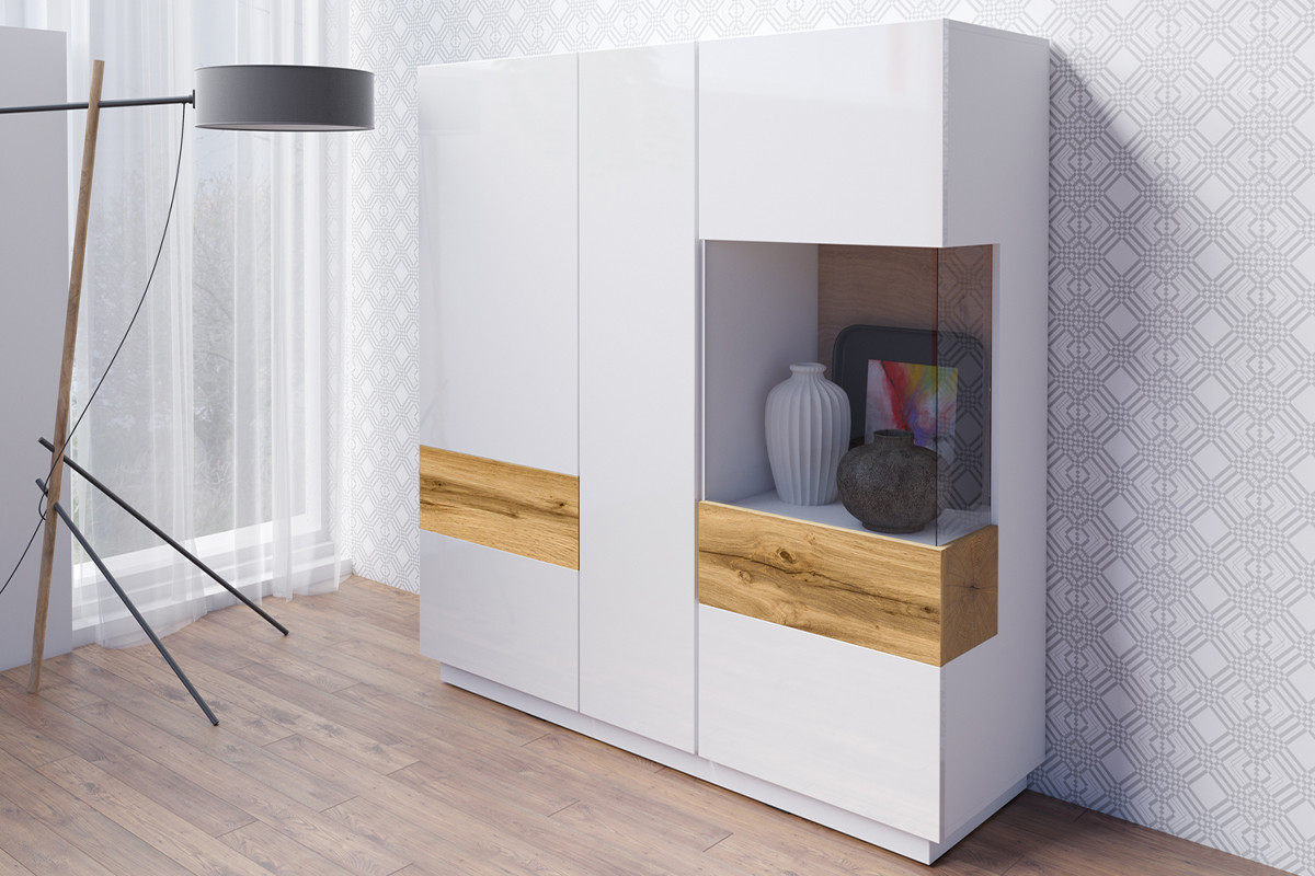 SILKE zobacz całą kolekcję Komoda z witryną - kolor biały połysk/dąb