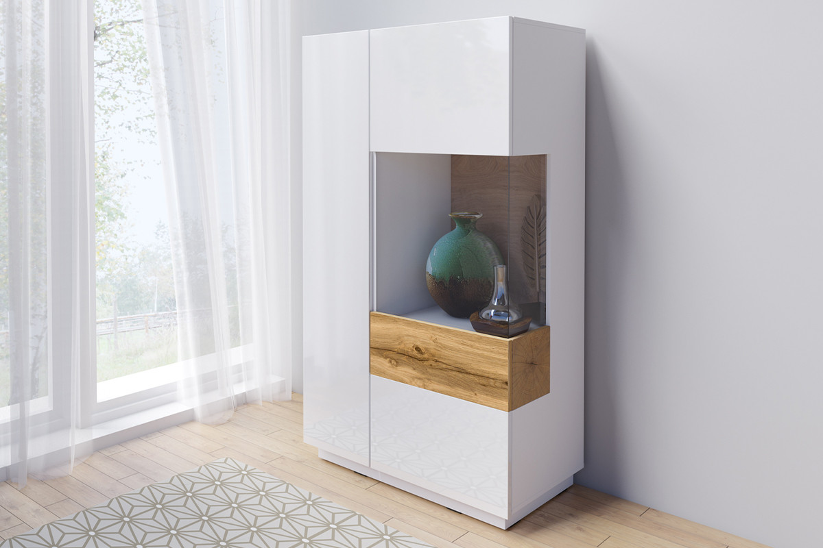 SILKE zobacz całą kolekcję Komoda z witryną prawa - kolor biały połysk/dąb