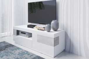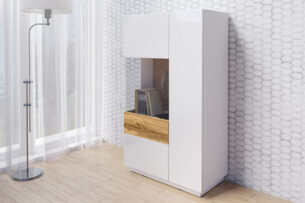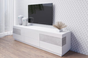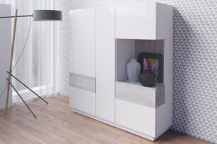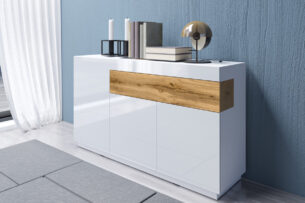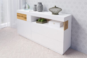 Czterodrzwiowa komoda z kolekcji Silke, wzbogacona o dodatkowe szuflady to propozycja, która sprawdzi się w każdym salonie. Bogaty wachlarz połączeń kolorystycznych – duet lśniącej bieli z dębem, antracyt z dębem oraz duet bieli z szarością to propozycje, które skradną serca nawet najbardziej wymagających klientów.