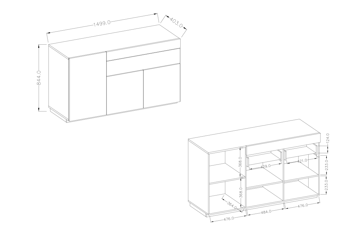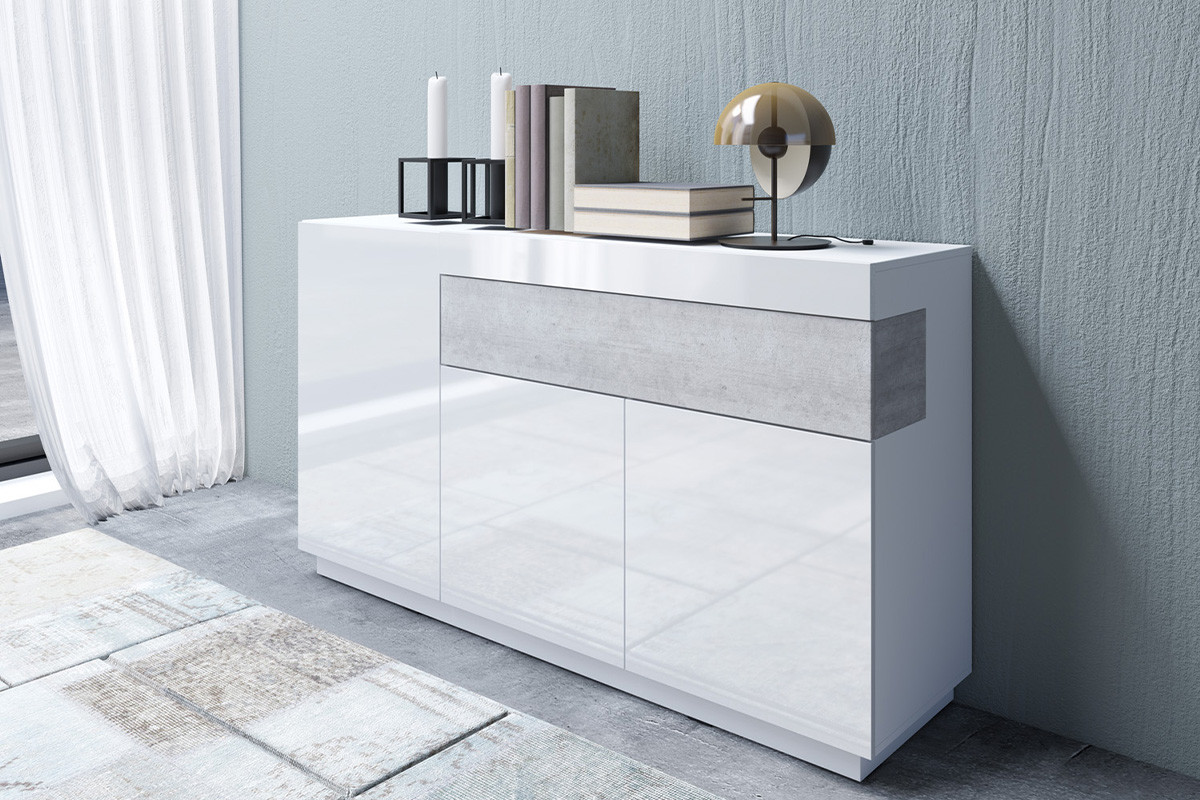 Trzydrzwiowa komoda z kolekcji Silke wyposażona w pojemną, długą szufladę. Dostępna w aż trzech połączeniach kolorystycznych - białego połysku z dębem, antracytu z dębem, a także białego z szarym daje nieograniczony wachlarz możliwości w aranżacji Twojego salonu.