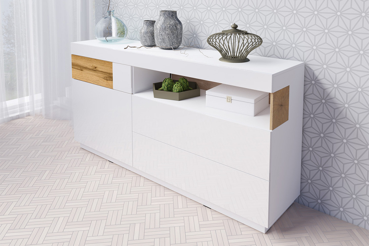 Ta nowoczesna komoda z kolekcji Silke to mebel, który można wykorzystać na wiele sposobów. Doskonale sprawdzi się jako klasyczna komoda w salonie, a dzięki wyposażeniu jej we wnękę znajdzie swoje zastosowanie również jako szafka RTV. Bogaty wachlarz połączeń kolorystycznych – duet lśniącej bieli z dębem, antracyt z dębem oraz duet bieli z szarością to najmodniejsze połączenia ostatnich lat, które sprawią, że Twój salon zyska na nowoczesności.