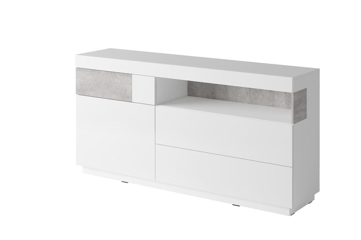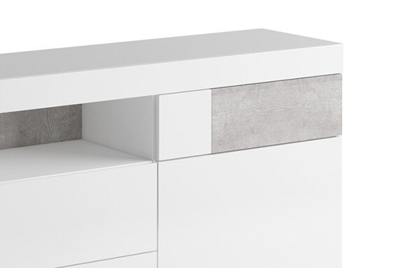 Ta nowoczesna komoda z kolekcji Silke to mebel, który można wykorzystać na wiele sposobów. Doskonale sprawdzi się jako klasyczna komoda w salonie, a dzięki wyposażeniu jej we wnękę znajdzie swoje zastosowanie również jako szafka RTV. Bogaty wachlarz połączeń kolorystycznych – duet lśniącej bieli z dębem, antracyt z dębem oraz duet bieli z szarością to najmodniejsze połączenia ostatnich lat, które sprawią, że Twój salon zyska na nowoczesności.