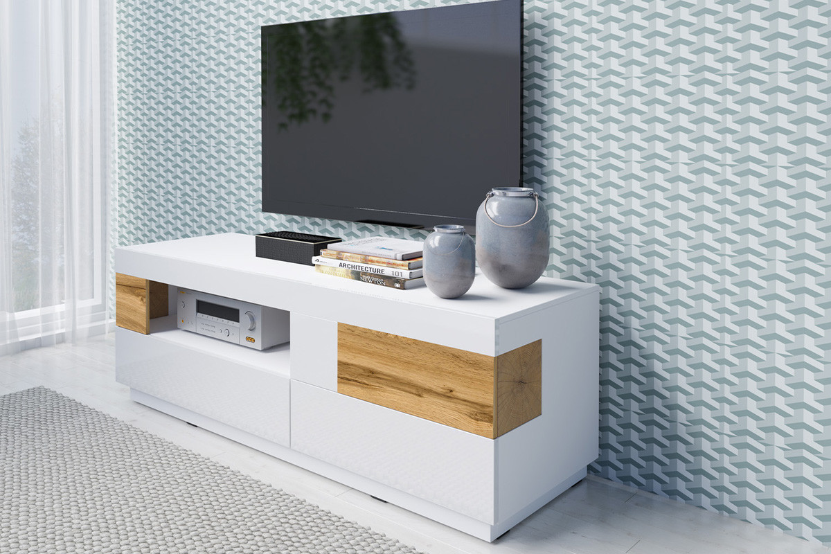 SILKE zobacz całą kolekcję Szafka RTV - kolor biały połysk/dąb