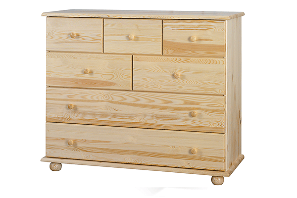 Pojemna komoda to mebel, który ułatwi Ci organizowanie domowej przestrzeni. W całości wykonana jest z wysokiej klasy drewna sosnowego o właściwościach antystatycznych – dzięki temu nie osiada na nim zbyt dużo kurzu. Jej solidna konstrukcja osadzona została na nóżkach w kształcie kul, które nadają jej niesamowitego uroku. Model dostępny jest w dwóch wariantach kolorystycznych: w naturalnej barwie lakierowanego drewna lub białej, pomalowanej bejcą.