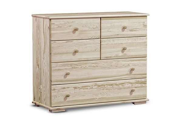 Do budowy szafki wykorzystano wysokiej klasy, lite drewno sosnowe z certyfikatem FSC, które następnie zostało pokryte ekologicznym lakierem, podkreślającym jego naturalną strukturę. Komoda jest więc nie tylko bardzo wytrzymała, ale wyróżnia się też pięknym, jasnym kolorem sosnowych belek. Ze względu na właściwości elektrostatyczne, blat szafki jest bardzo łatwy czyszczeniu.