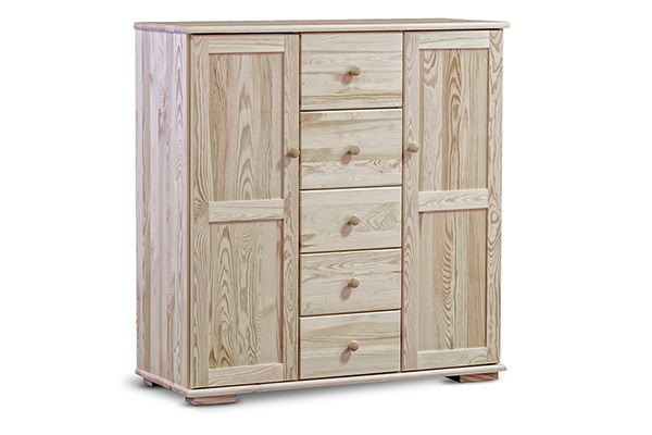 Krawędzie górnego blatu są lekko zaokrąglone, drzwiczki od przestrzeni z półkami zdobią subtelne frezy, a uchwyty od szuflad mają ładny, kulisty kształt. Wszystkie te elementy tworzą mebel, który z pewnością ozdobi niejeden salon. Duża komoda została wykonana z wysokogatunkowego, litego drewna sosnowego z certyfikatem FSC, a następnie - pokryta ekologicznym lakierem.