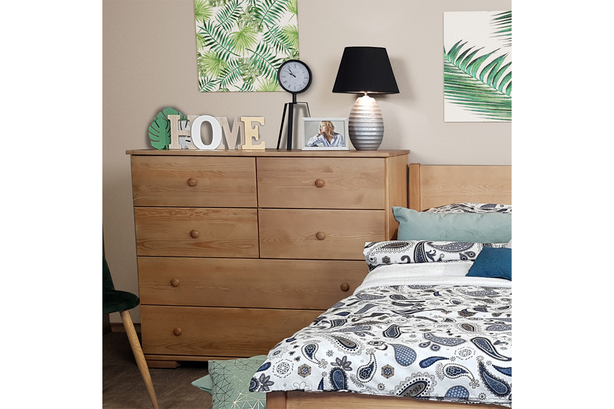 W całości zostało wykonane z litego drewna sosnowego, które - dzięki swoim wyjątkowym właściwościom - nie pokrywa się kurzem. Co więcej, jego długie nóżki tworzą między łóżkiem a podłogą sporą przestrzeń, co ułatwia odkurzanie powierzchni pod meblem. Dzięki wszystkim tym atutom zapewni Ci on wygodny, bezpieczny i zdrowy sen. Dostępny jest w kilku rozmiarach.