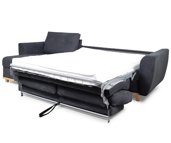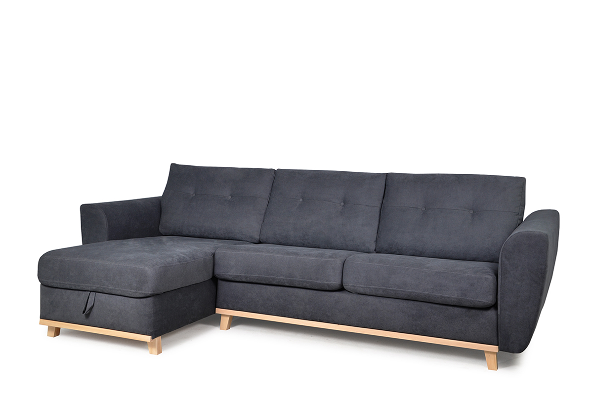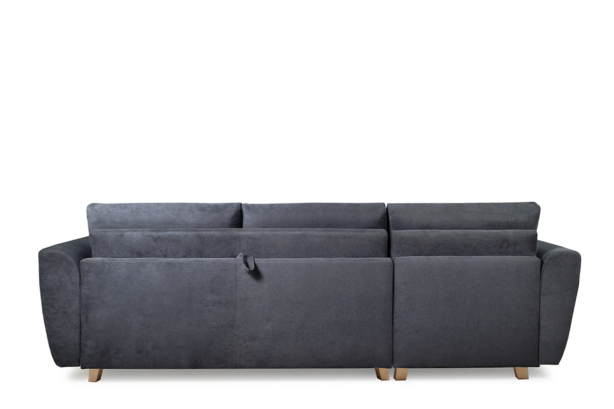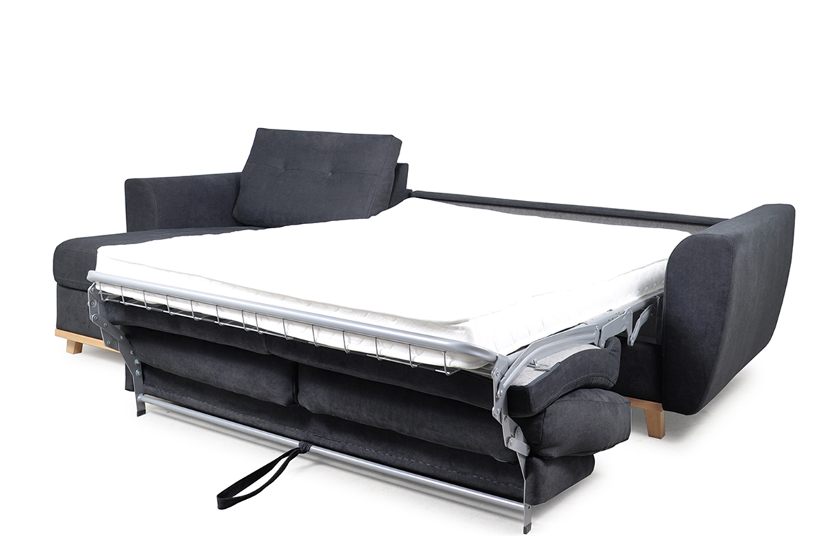 Elegancka sofa narożna z funkcją spania w grafitowym kolorze, idealne rozwiązanie dla nowoczesnych mieszkań. Narożnik Sorbi wyposażony jest w duży pojemnik z wygodnym uchwytem, który ułatwia jego otwieranie. Zamontowano w niej belgijski system rozkładania, który kryje w sobie duży materac z pianki PUR, o powierzchni 140x184 cm, zatem tyle, ile mają duże łóżka.