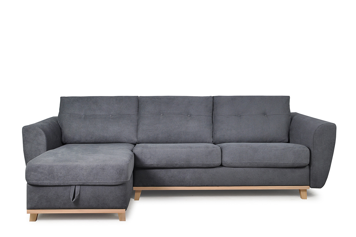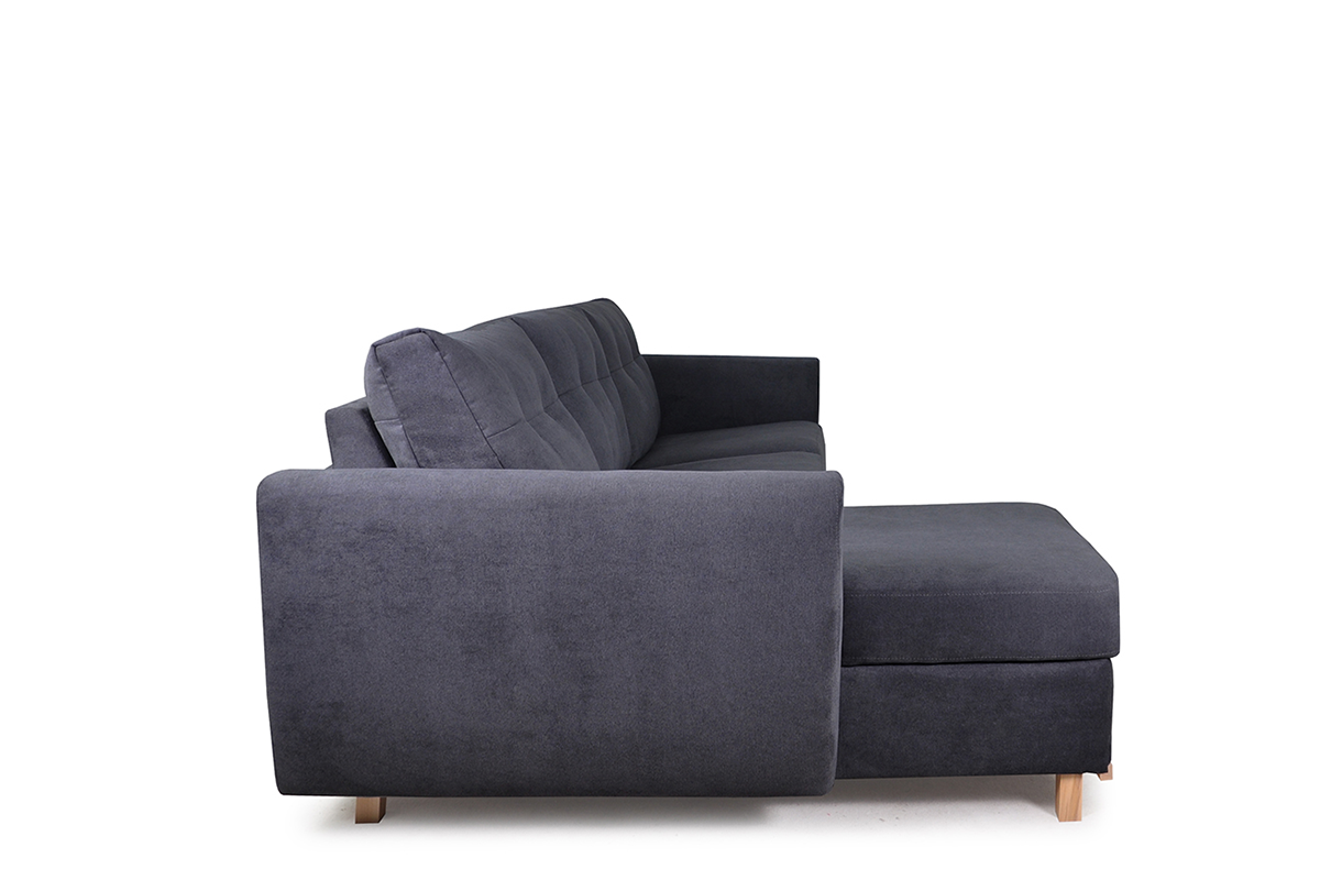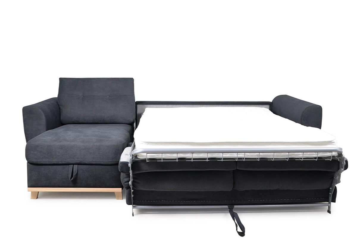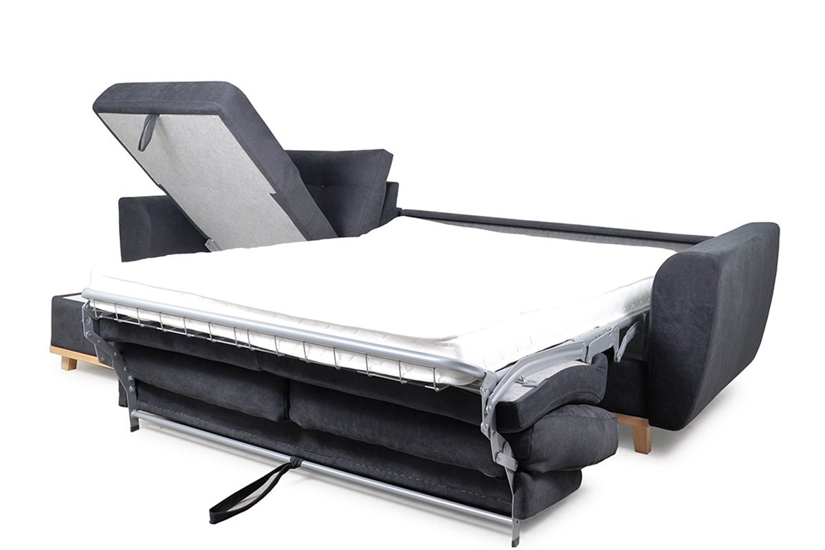 Elegancka sofa narożna z funkcją spania w grafitowym kolorze, idealne rozwiązanie dla nowoczesnych mieszkań. Narożnik Sorbi wyposażony jest w duży pojemnik z wygodnym uchwytem, który ułatwia jego otwieranie. Zamontowano w niej belgijski system rozkładania, który kryje w sobie duży materac z pianki PUR, o powierzchni 140x184 cm, zatem tyle, ile mają duże łóżka.