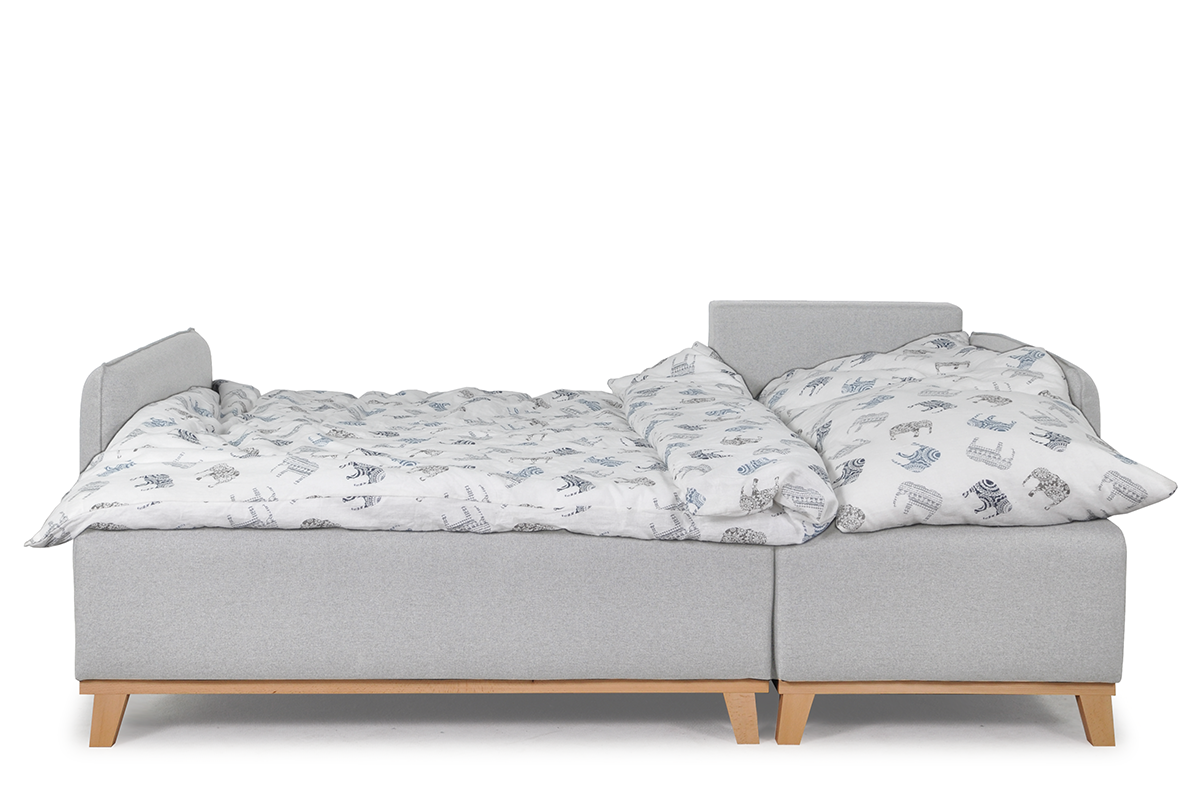 Sofa narożna Maril wykonana jest z wysokiej jakości tkaniny tapicerskiej w modnym szarym kolorze, dostępnym w dwóch odcieniach, jasnym i ciemnym, o delikatnym połysku. Materiał dobrze się prezentuje i jest łatwy w utrzymaniu go w czystości. Narożnik posiada spory pojemnik na pościel i wygodny mechanizm, za pomocą którego rozkłada się wygodny materac do spania z pianki PUR o powierzchni 132x202 centymetrów.