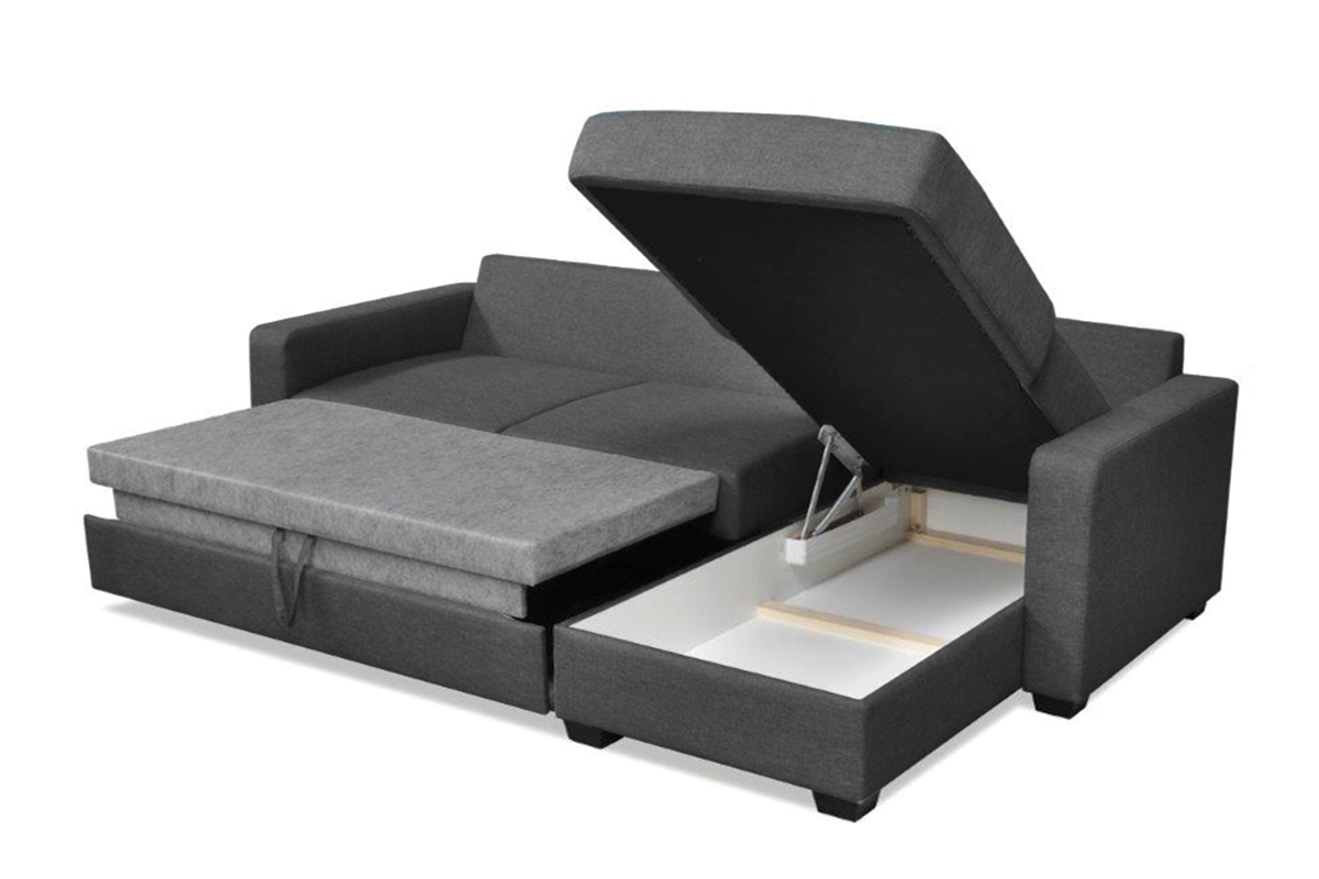 Sofa narożna Jugo to propozycja dla tych z was, którzy potrzebują dużo miejsca, do siedzenia, spania i przechowania pościeli. Narożnik wyposażony jest w duży pojemnik do przechowywania, który pomieści sporo rzeczy, jest wyposażony w automatyczny system otwierania, który maksymalnie ułatwia korzystanie z niego. Narożnik Jugo jest otwierany na system typu delfin, oznacza to, że spod siedziska wyciągamy wózek, na którym jest materac i rozkładamy nogę pod nim.