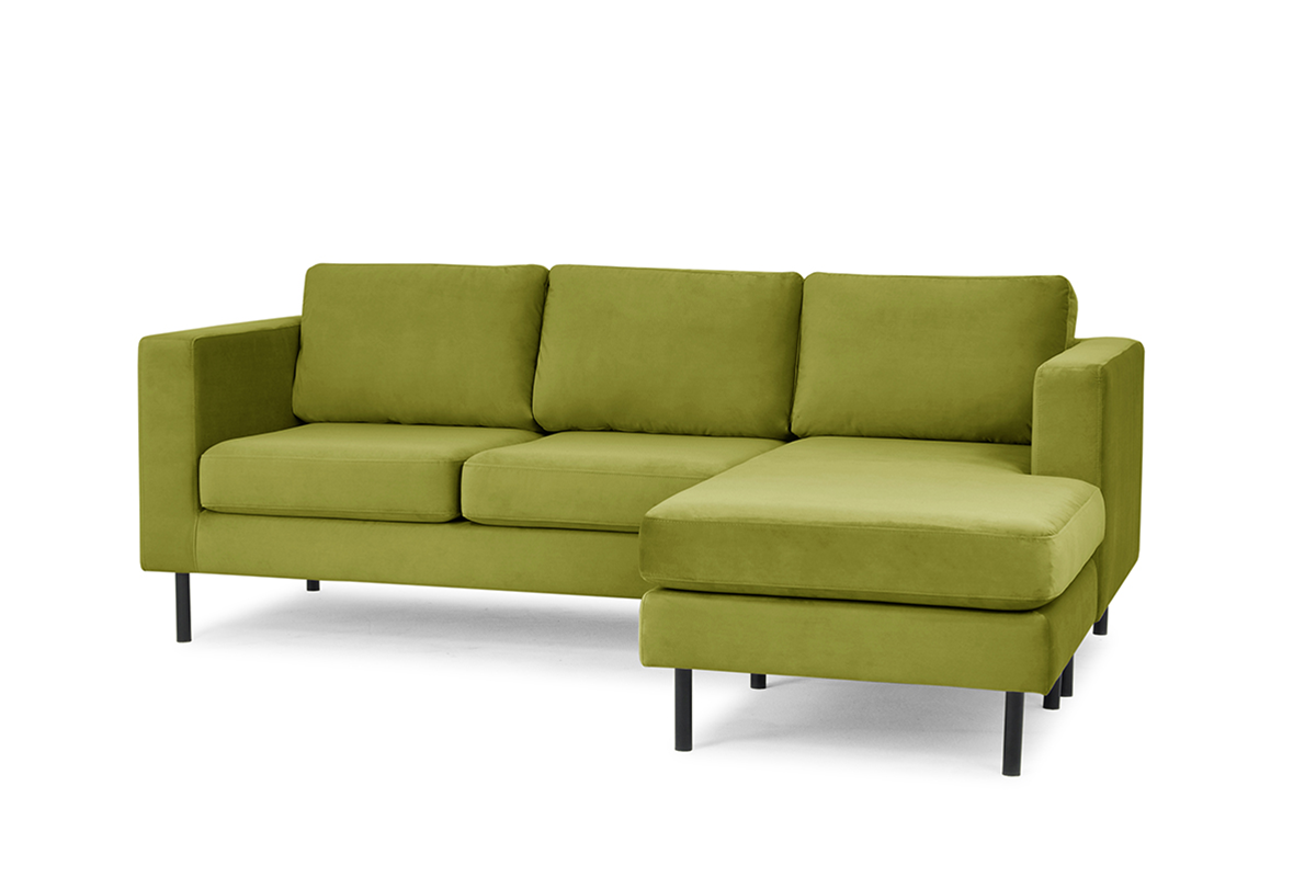 Ten duży narożnik co prawda nie ma funkcji spania, bo rolę otomany odgrywa tutaj luźno dostawiona pufa przykryta wspólnym siedziskiem, ale w niektórych okolicznościach może być wygodnym, pojedynczym łóżkiem. Welurowy narożnik dostępy jest w kolorze granatowym, zielonym, oliwkowym i pudrowym różu, wykończony jest metalowymi nogami.