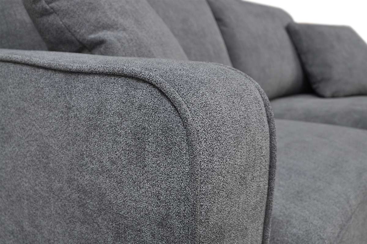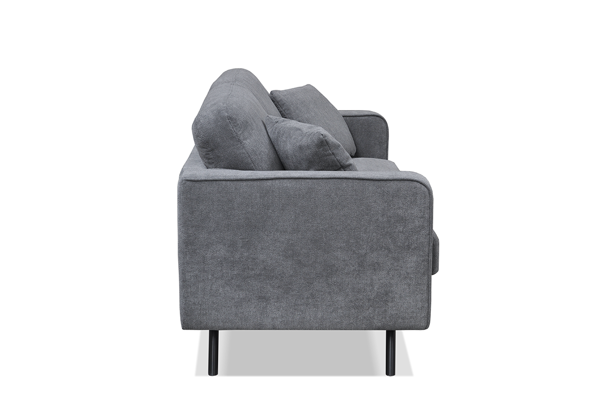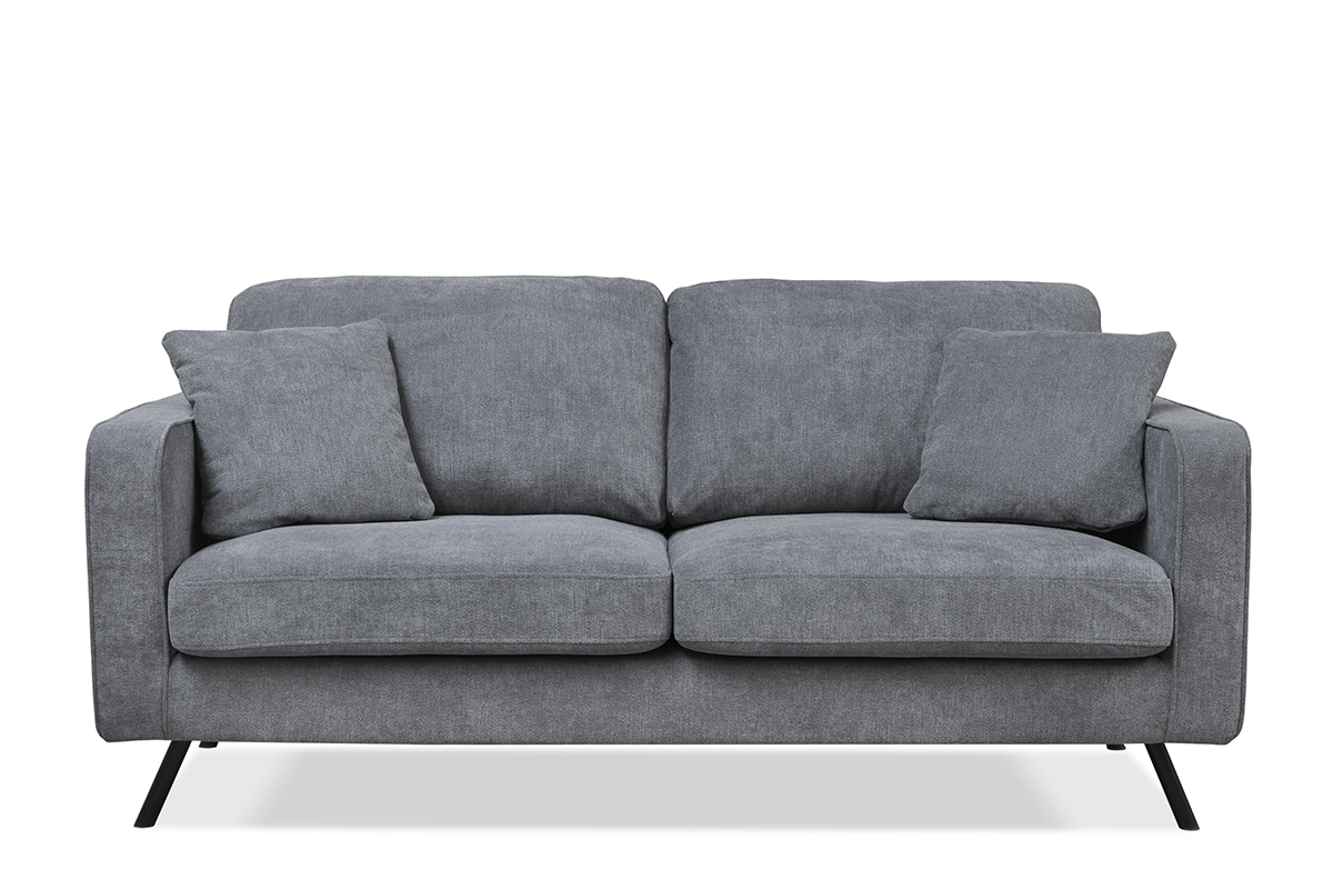 Piękna sofa o prostych, delikatnie zaokrąglonych kształtach wyposażona dodatkowo w 2 poduchy ozdobne w tym samym kolorze co tapicerka, a ta jest w kolorze szarym. Elegancka sofa Feli ma metalowe, czarne nogi, dzięki którym mebel wydaje się smuklejszy. Wygodne korzystanie z niego zapewnia dobrej jakości, odporna pianka HR.
