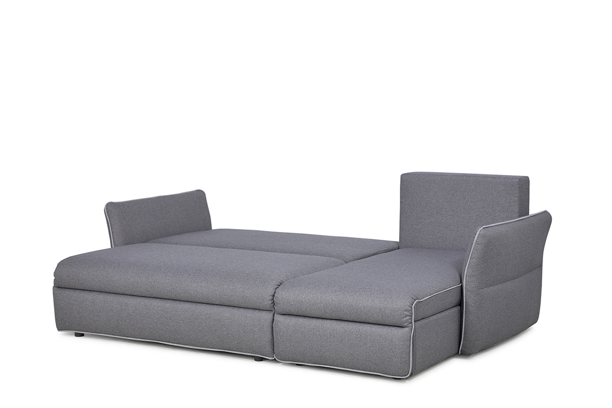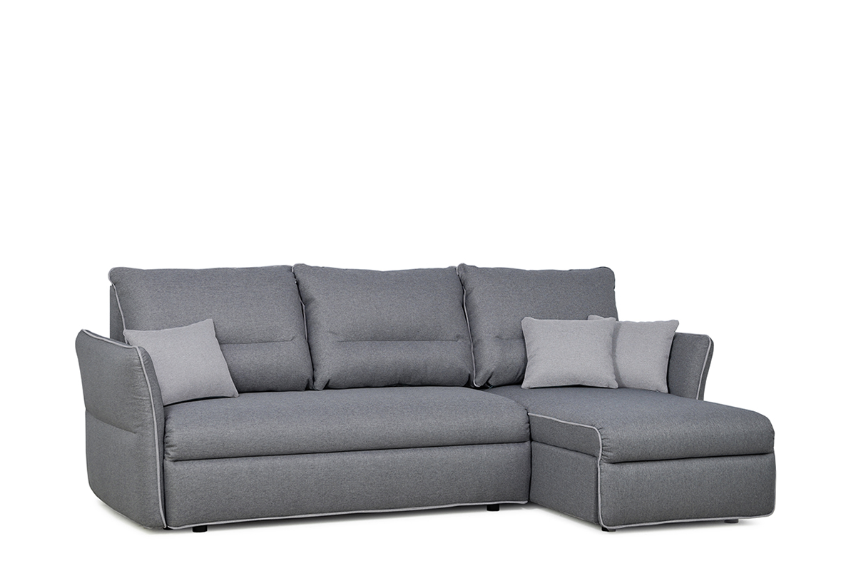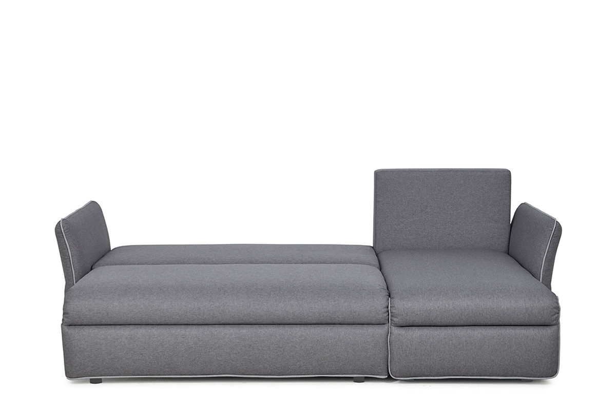 Duży komfortowy narożnik do dużego salonu z kolekcji Justi. Ta szara rozkładana sofa narożna jest wygodnym siedziskiem oraz w razie potrzeby może się stać wygodnym łóżkiem, o powierzchni 204x 130 cm. W sofie zamontowano wygodny mechanizm rozkładania typu przewracak, aby rozłożyć spanie wystarczy pociągnąć siedzisko do siedzi i opuścić oparcie na jego miejsce i wygodne dodatkowe łózko gotowe.