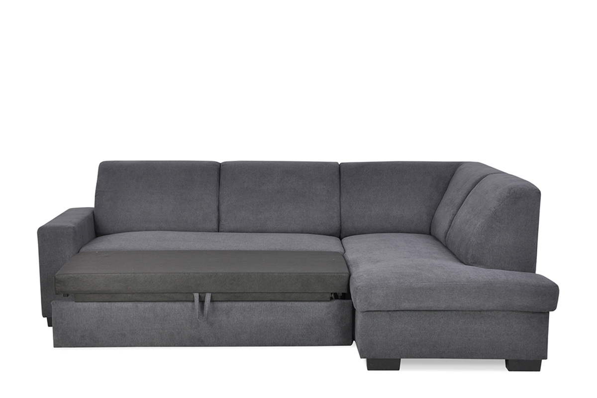Duża uniwersalna sofa narożna Grano, którą można rozłożyć, wyposażona jest w mechanizm rozkładania typu Delfin, dzięki któremu za pomocą jednego pociągnięcia uchwytu przy siedzisku rozkładamy wygodny materac. Mechanizm ten ma ukryty wygodny materac do spania o powierzchni 194x123 cm i wysokości 8 cm, wykonany z wysokiej jakości pianki PUR.