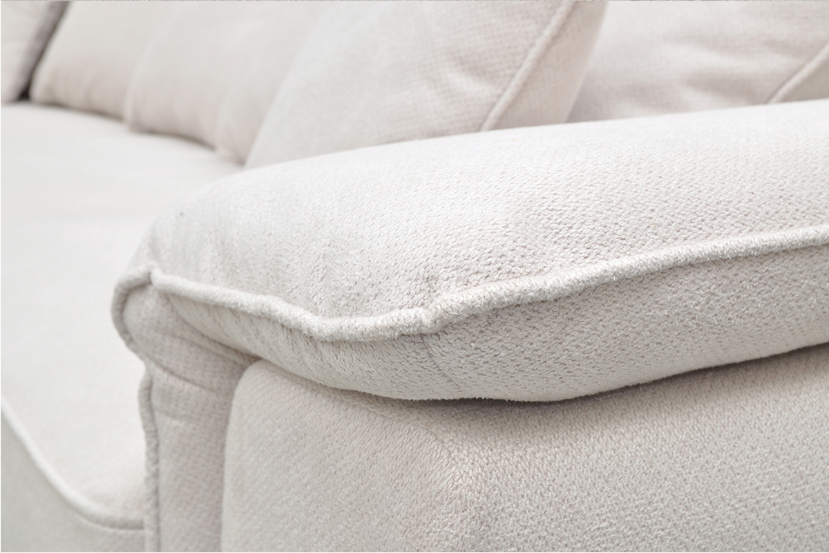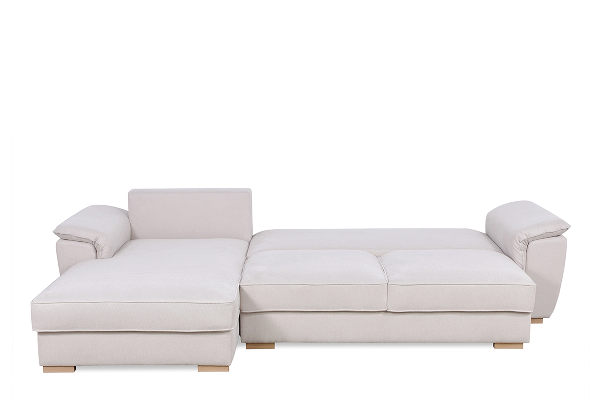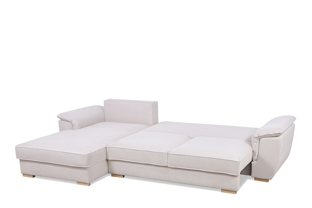 Elegancki, jasny narożnik z funkcją spania w delikatnym beżowym kolorze, idealne rozwiązanie do nowoczesnego mieszkania lub tego gdzie rządzi klasyka. Duży, komfortowy narożnik wyposażony jest w pojemnik na pościel. Zamontowano w nim system rozkładania, typu delfin, który kryje w sobie duży materac z pianki PUR, o powierzchni 240x122 cm, zatem tyle, ile mają duże łóżka.